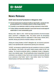 Mumbai, India – March 9, 2023 – BASF has begun production of its first bio-based polyol, Sovermol®, in Mangalore, India. This product serves the fast-growing demand of eco-friendly products for applications in New Energy Vehicles (NEV), windmills, flooring and protective industrial coatings in Asia Pacific.