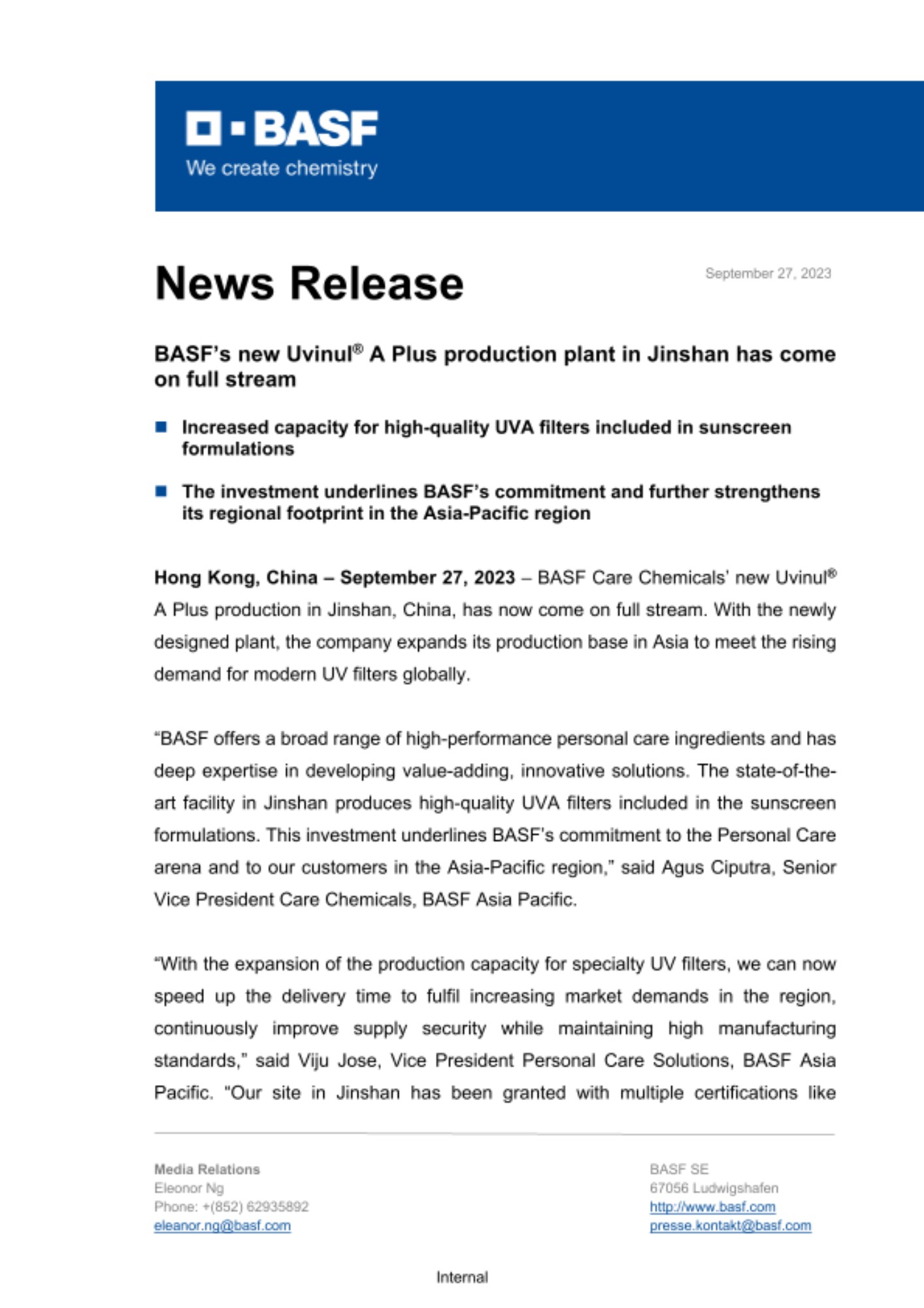 Hong Kong, China – September 27, 2023 – BASF Care Chemicals’ new Uvinul® A Plus production in Jinshan, China, has now come on full stream. With the newly designed plant, the company expands its production base in Asia to meet the rising demand for modern UV filters globally.