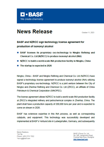 BASF and NZRCC sign technology license agreement for production of isononyl alcohol