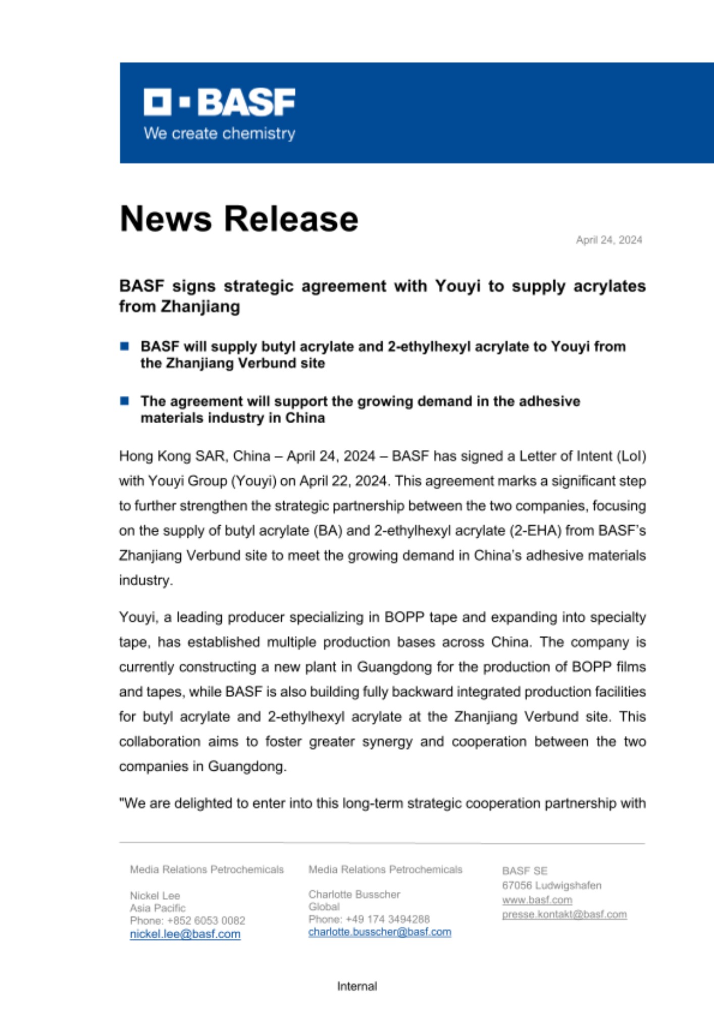 "We are delighted to enter into this long-term strategic cooperation partnership with Youyi, which marks the first customer agreement to supply acrylates from the Zhanjiang Verbund site," said Haibo Tian, Vice President, Industrial Petrochemicals Asia Pacific, BASF. "With the upcoming production startups of Youyi’s new production facility in Guangdong and BASF’s acrylic acid complex at our Zhanjiang Verbund site in 2025, we are confident that this agreement will create mutual benefits, ensuring competitiveness and reliability to support the growth of the adhesive tape industry.