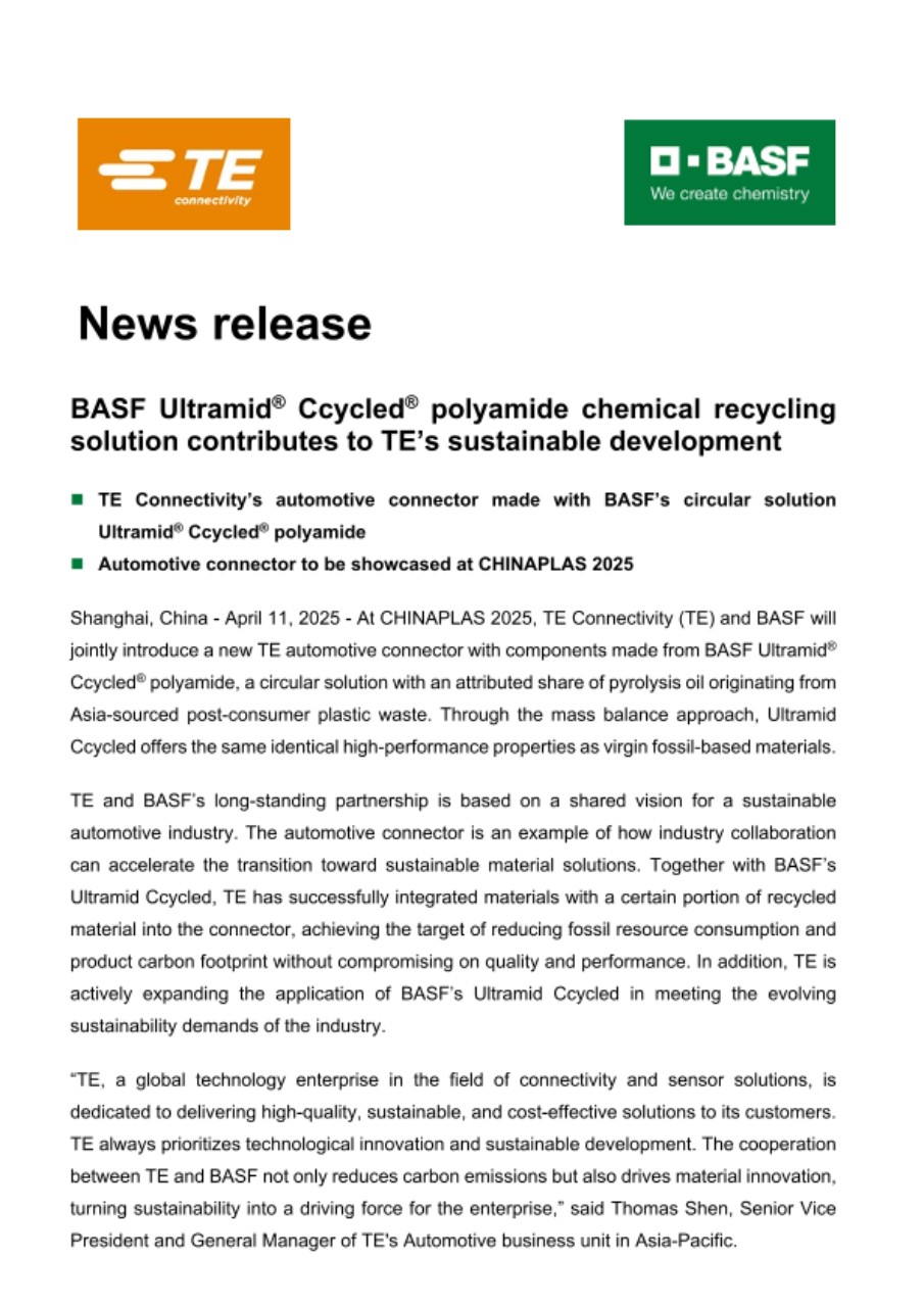 “TE, a global technology enterprise in the field of connectivity and sensor solutions, is dedicated to delivering high-quality, sustainable, and cost-effective solutions to its customers. TE always prioritizes technological innovation and sustainable development. The cooperation between TE and BASF not only reduces carbon emissions but also drives material innovation, turning sustainability into a driving force for the enterprise,” said Thomas Shen, Senior Vice President and General Manager of TE's Automotive business unit in Asia-Pacific.