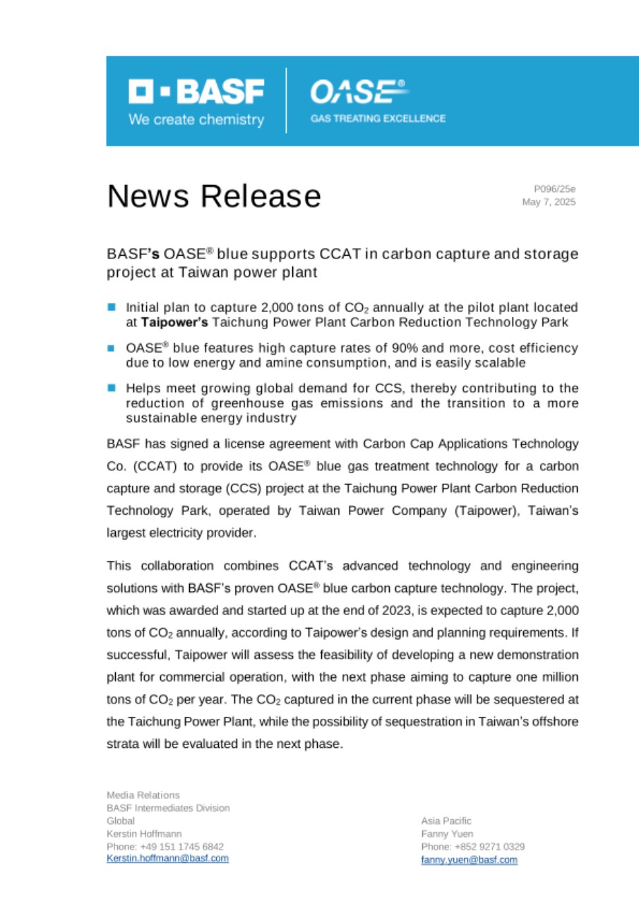 Daniel Yao, Managing Director, CCAT, said, “In the context of the current environmental and energy transition, CCAT deeply understands the importance of promoting sustainable development and reducing carbon emissions. We are honored to undertake Taiwan’s first carbon capture commercial demonstration project and collaborate with BASF, utilizing its advanced OASE® blue technology. This partnership aims to enhance the technical level and outcomes of environmental protection projects. It will further drive the development of both parties in the green energy sector, while also providing Taipower with more efficient solutions to promote clean emissions in the energy production process.”