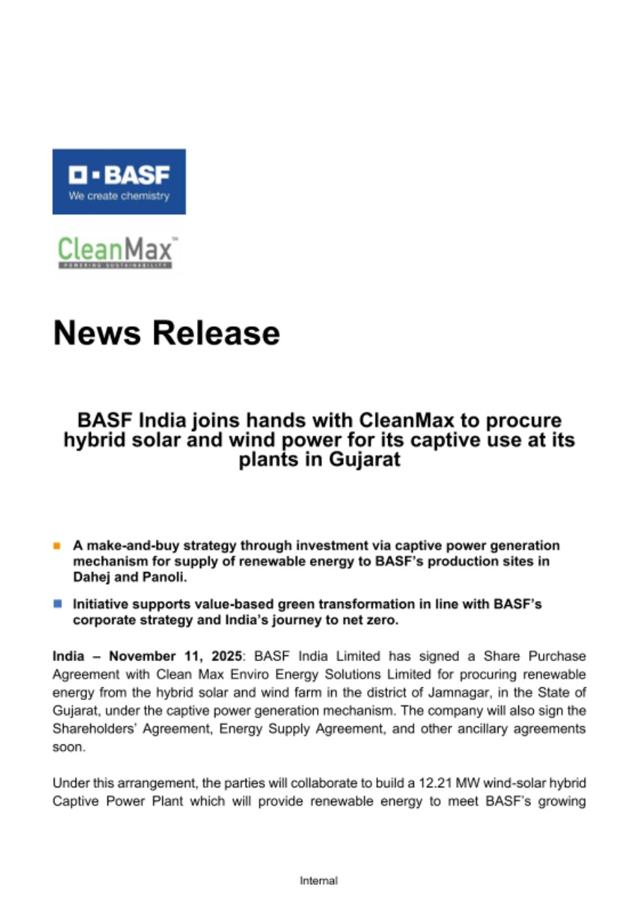 India – November 11, 2025: BASF India Limited has signed a Share Purchase Agreement with Clean Max Enviro Energy Solutions Limited for procuring renewable energy from the hybrid solar and wind farm in the district of Jamnagar, in the State of Gujarat, under the captive power generation mechanism. The company will also sign the Shareholders’ Agreement, Energy Supply Agreement, and other ancillary agreements soon.