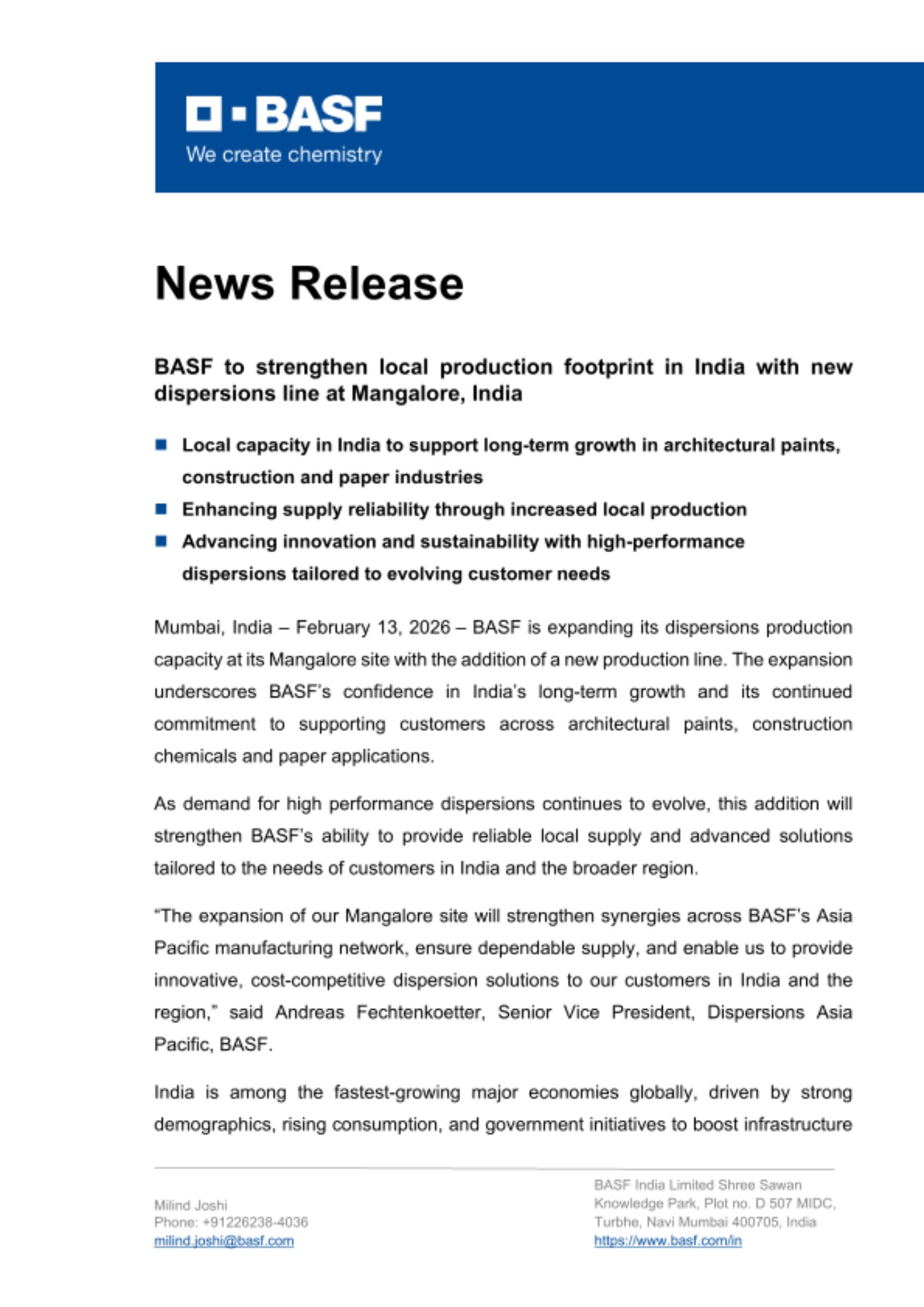 Mumbai, India – February 13, 2026 – BASF is expanding its dispersions production capacity at its Mangalore site with the addition of a new production line. The expansion underscores BASF’s confidence in India’s long-term growth and its continued commitment to supporting customers across architectural paints, construction chemicals and paper applications.