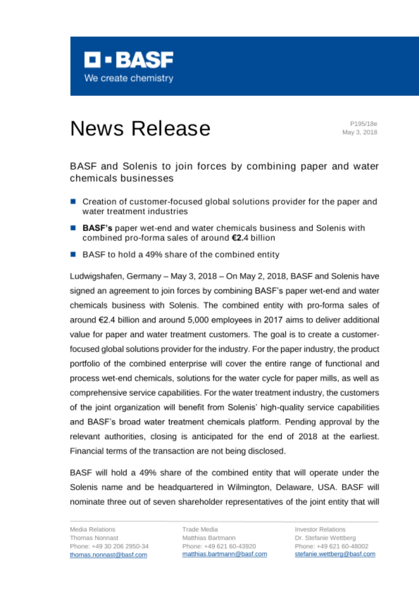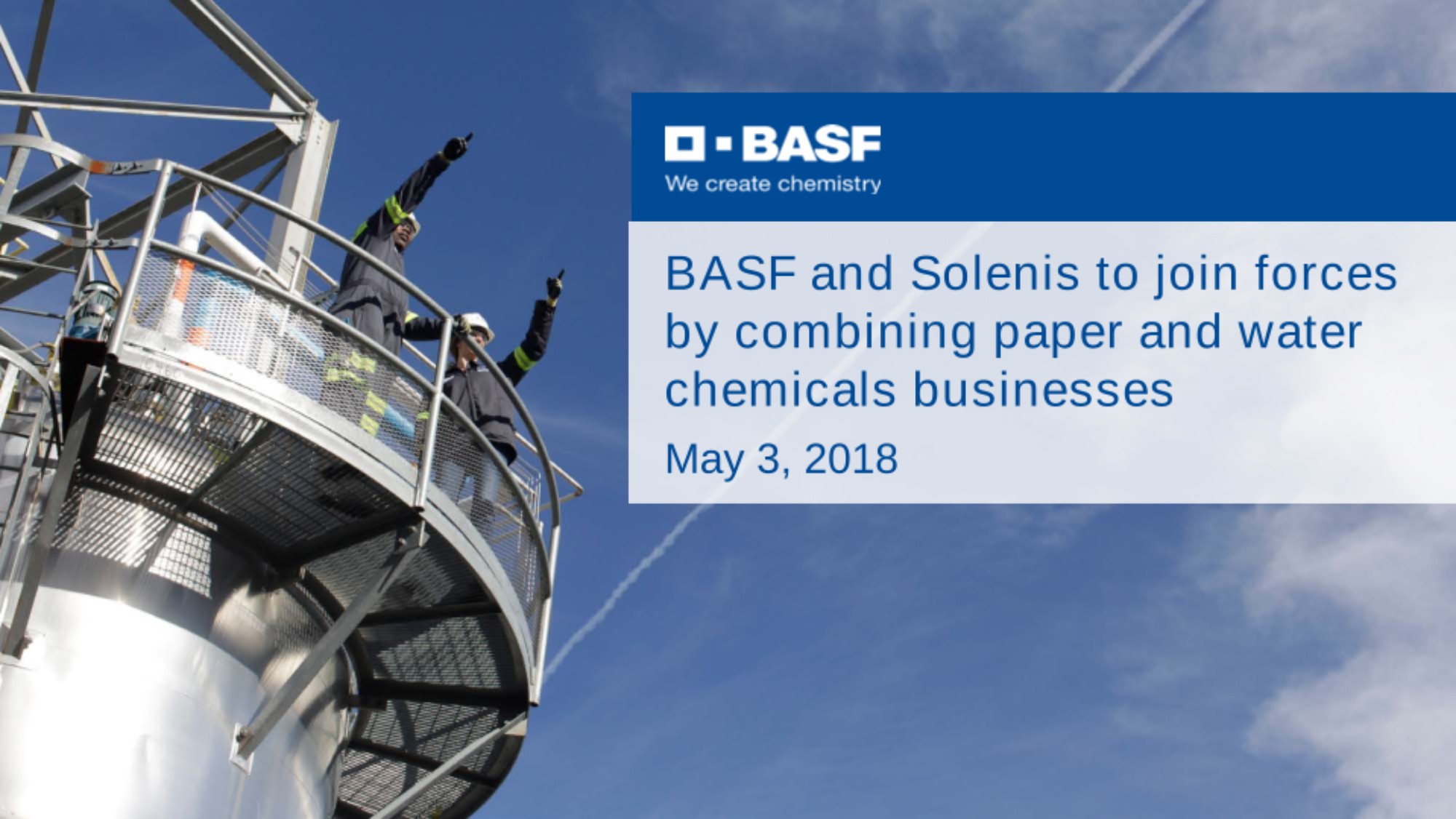 Ludwigshafen, Germany – May 3, 2018 – On May 2, 2018, BASF and Solenis have signed an agreement to join forces by combining BASF’s paper wet-end and water chemicals business with Solenis. The combined entity with pro-forma sales of around €2.4 billion and around 5,000 employees in 2017 aims to deliver additional value for paper and water treatment customers. The goal is to create a customer-focused global solutions provider for the industry. For the paper industry, the product portfolio of the combined enterprise will cover the entire range of functional and process wet-end chemicals, solutions for the water cycle for paper mills, as well as comprehensive service capabilities. For the water treatment industry, the customers of the joint organization will benefit from Solenis’ high-quality service capabilities and BASF’s broad water treatment chemicals platform. Pending approval by the relevant authorities, closing is anticipated for the end of 2018 at the earliest. Financial terms of the transaction are not being disclosed.