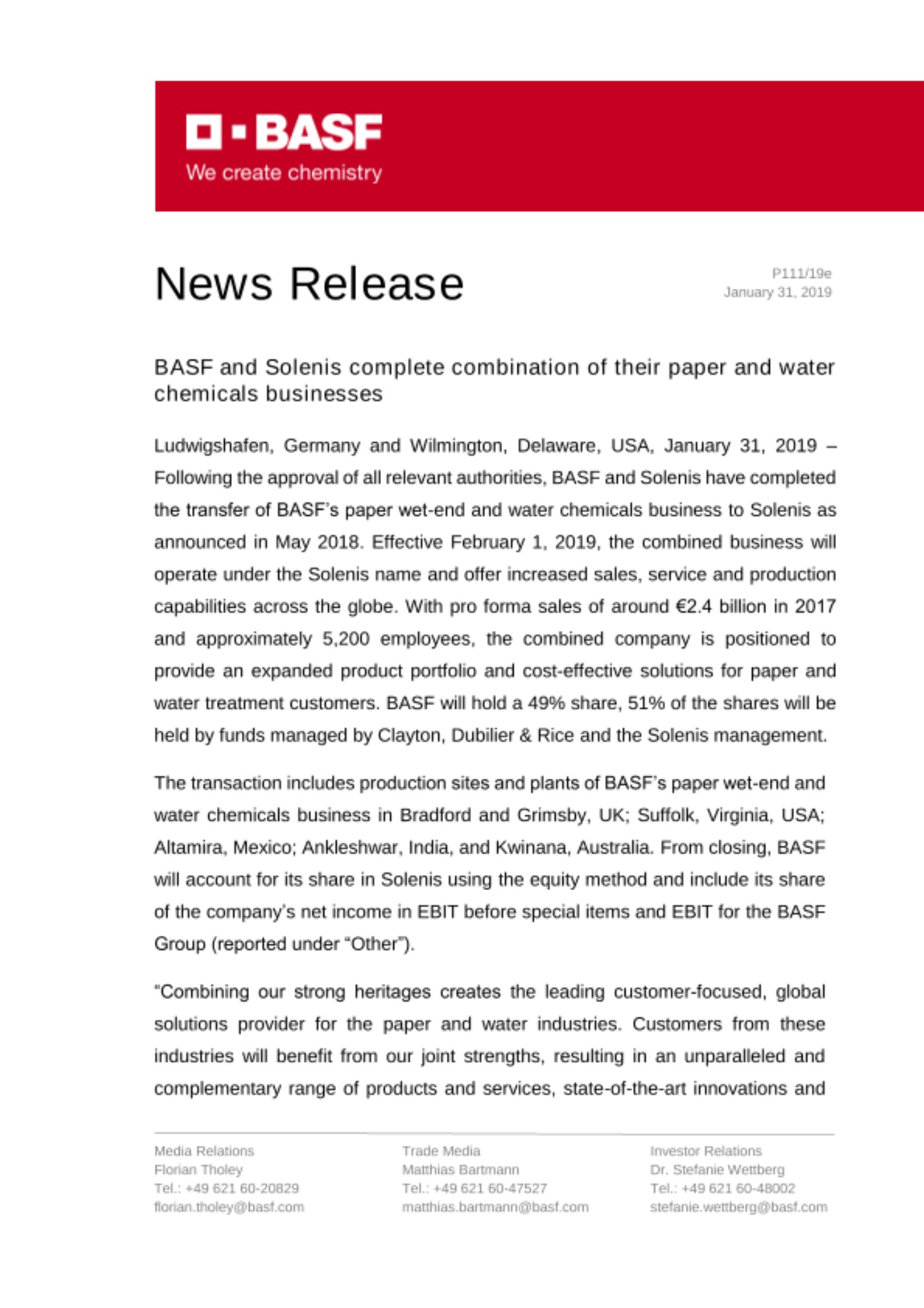 Ludwigshafen, Germany and Wilmington, Delaware, USA, January 31, 2019 – Following the approval of all relevant authorities, BASF and Solenis have completed the transfer of BASF’s paper wet-end and water chemicals business to Solenis as announced in May 2018. Effective February 1, 2019, the combined business will operate under the Solenis name and offer increased sales, service and production capabilities across the globe. With pro forma sales of around €2.4 billion in 2017 and approximately 5,200 employees, the combined company is positioned to provide an expanded product portfolio and cost-effective solutions for paper and water treatment customers. BASF will hold a 49% share, 51% of the shares will be held by funds managed by Clayton, Dubilier & Rice and the Solenis management.