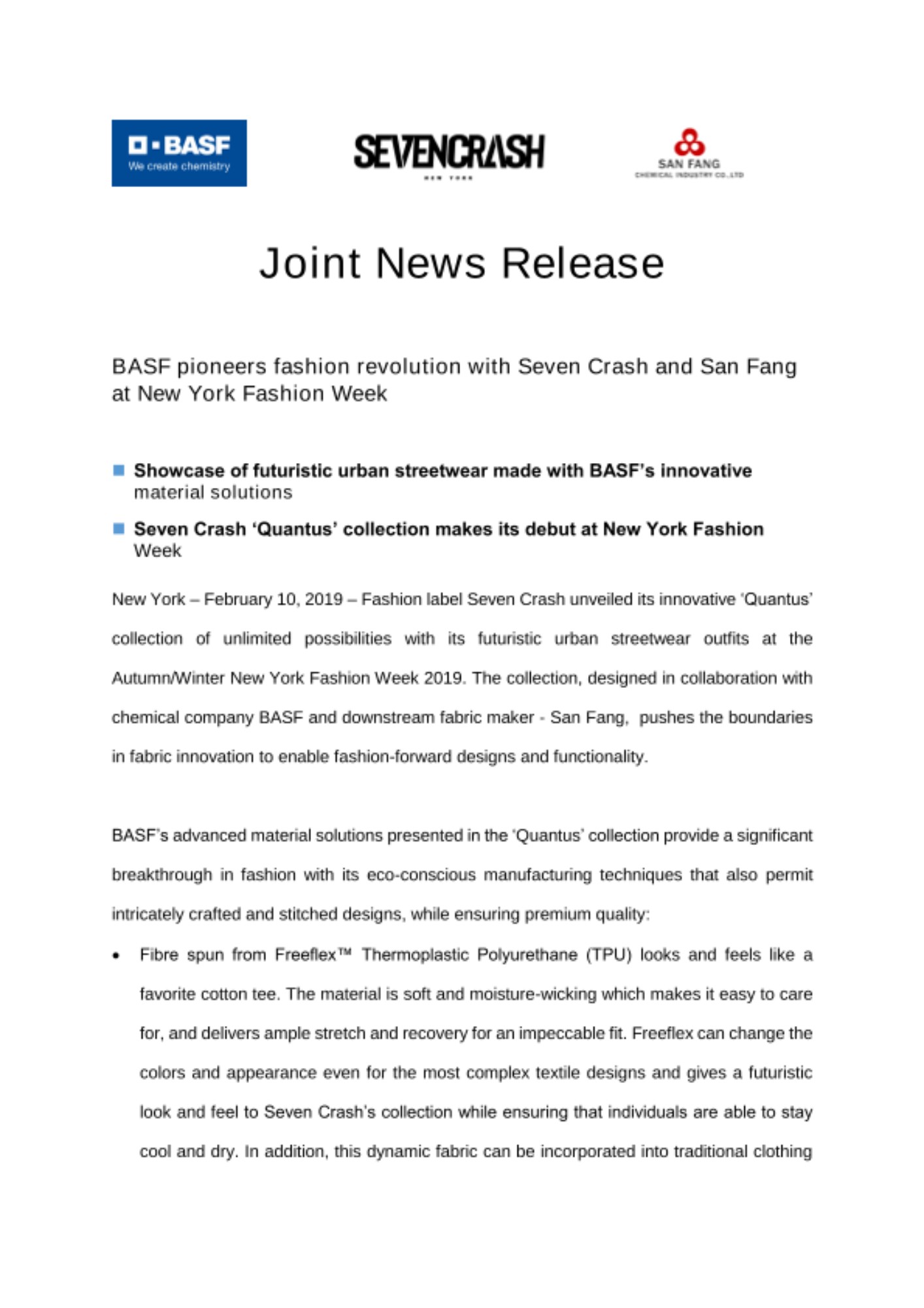 “San Fang has also been developing market-driven innovations that have redefined materials in consumer industries such as fashion and footwear,” said Mr. Lin Chih-Yi, President, San Fang Chemical Industry Co., Ltd.. “The collaboration with BASF and Seven Crash for Freeflex using new sustainable manufacturing techniques demonstrates our commitment to match eco-fashion trends with functional fibers and artificial leather which are made possible with TPU.”
