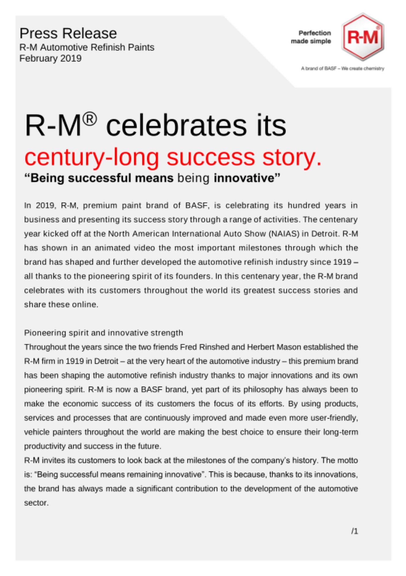 In 2019, R-M, premium paint brand of BASF, is celebrating its hundred years in business and presenting its success story through a range of activities. The centenary year kicked off at the North American International Auto Show (NAIAS) in Detroit. R-M has shown in an animated video the most important milestones through which the brand has shaped and further developed the automotive refinish industry since 1919 – all thanks to the pioneering spirit of its founders. In this centenary year, the R-M brand celebrates with its customers throughout the world its greatest success stories and share these online.