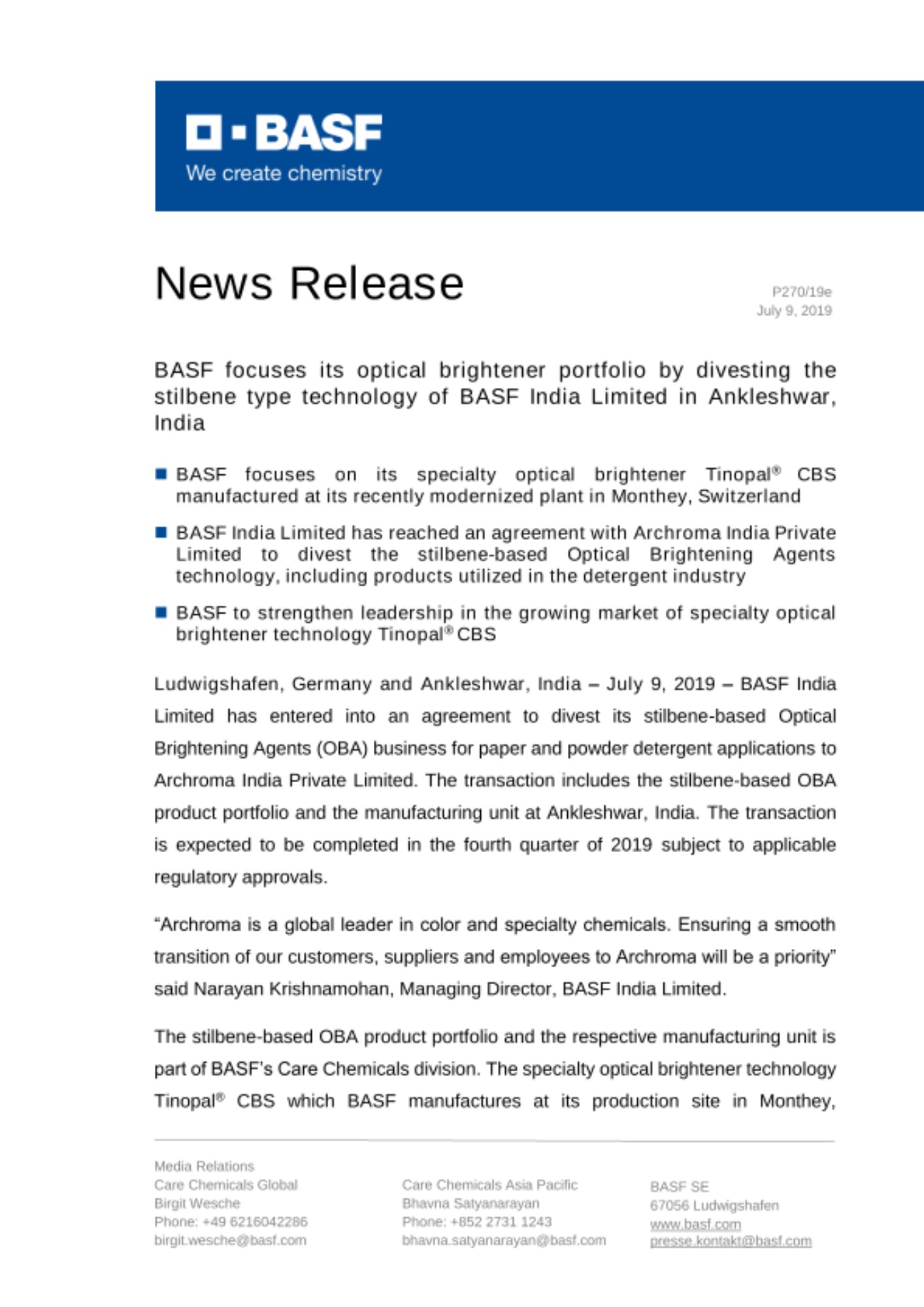 Ludwigshafen, Germany and Ankleshwar, India – July 9, 2019 – BASF India Limited has entered into an agreement to divest its stilbene-based Optical Brightening Agents (OBA) business for paper and powder detergent applications to Archroma India Private Limited. The transaction includes the stilbene-based OBA product portfolio and the manufacturing unit at Ankleshwar, India. The transaction is expected to be completed in the fourth quarter of 2019 subject to applicable regulatory approvals.