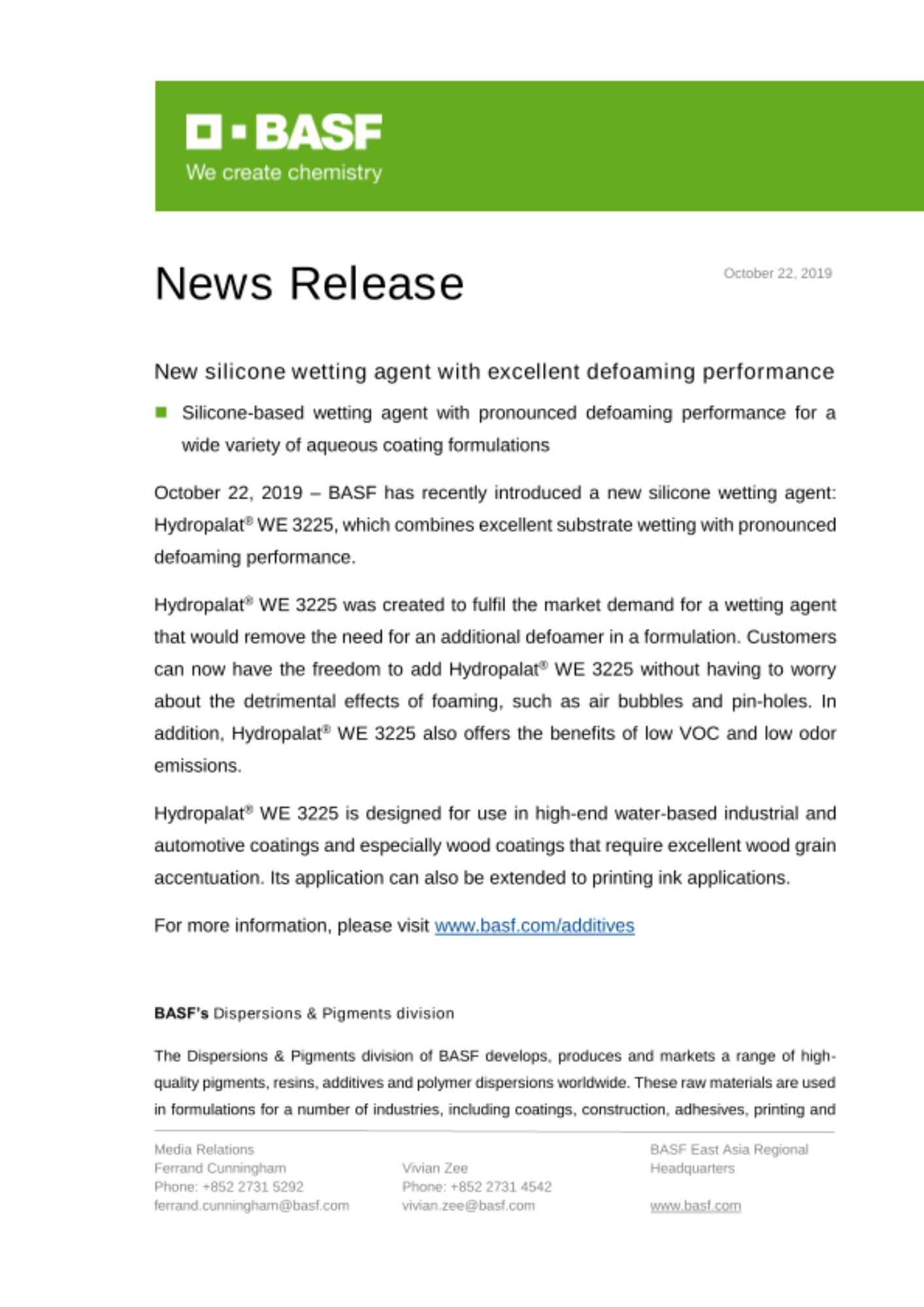 October 22, 2019 – BASF has recently introduced a new silicone wetting agent: Hydropalat® WE 3225, which combines excellent substrate wetting with pronounced defoaming performance.