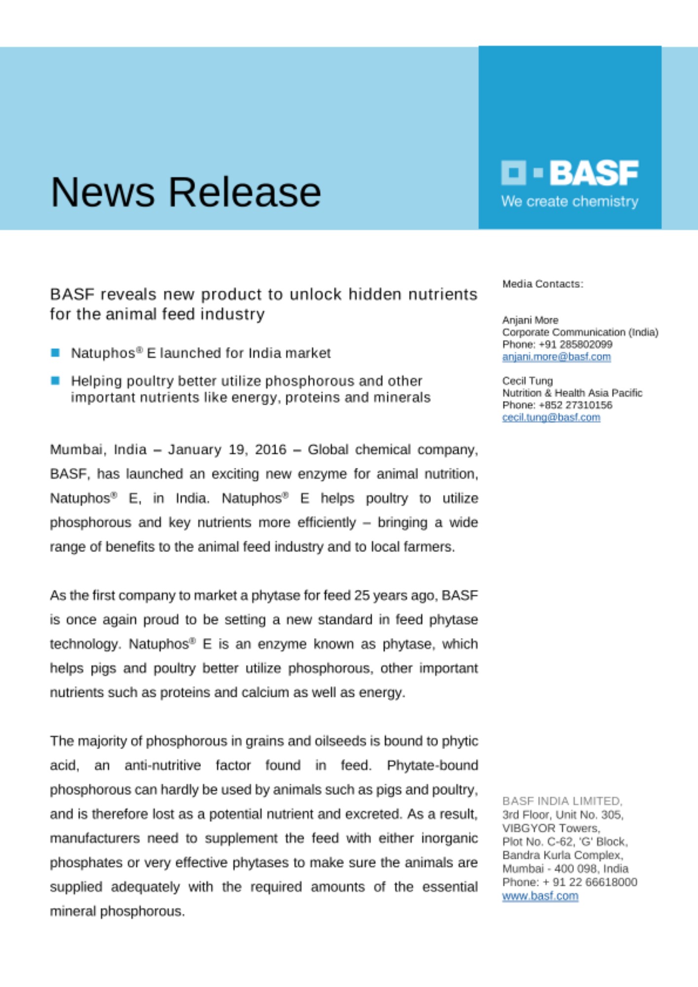 Mumbai, India – January 19, 2016 – Global chemical company, BASF, has launched an exciting new enzyme for animal nutrition, Natuphos® E, in India. Natuphos® E helps poultry to utilize phosphorous and key nutrients more efficiently – bringing a wide range of benefits to the animal feed industry and to local farmers.