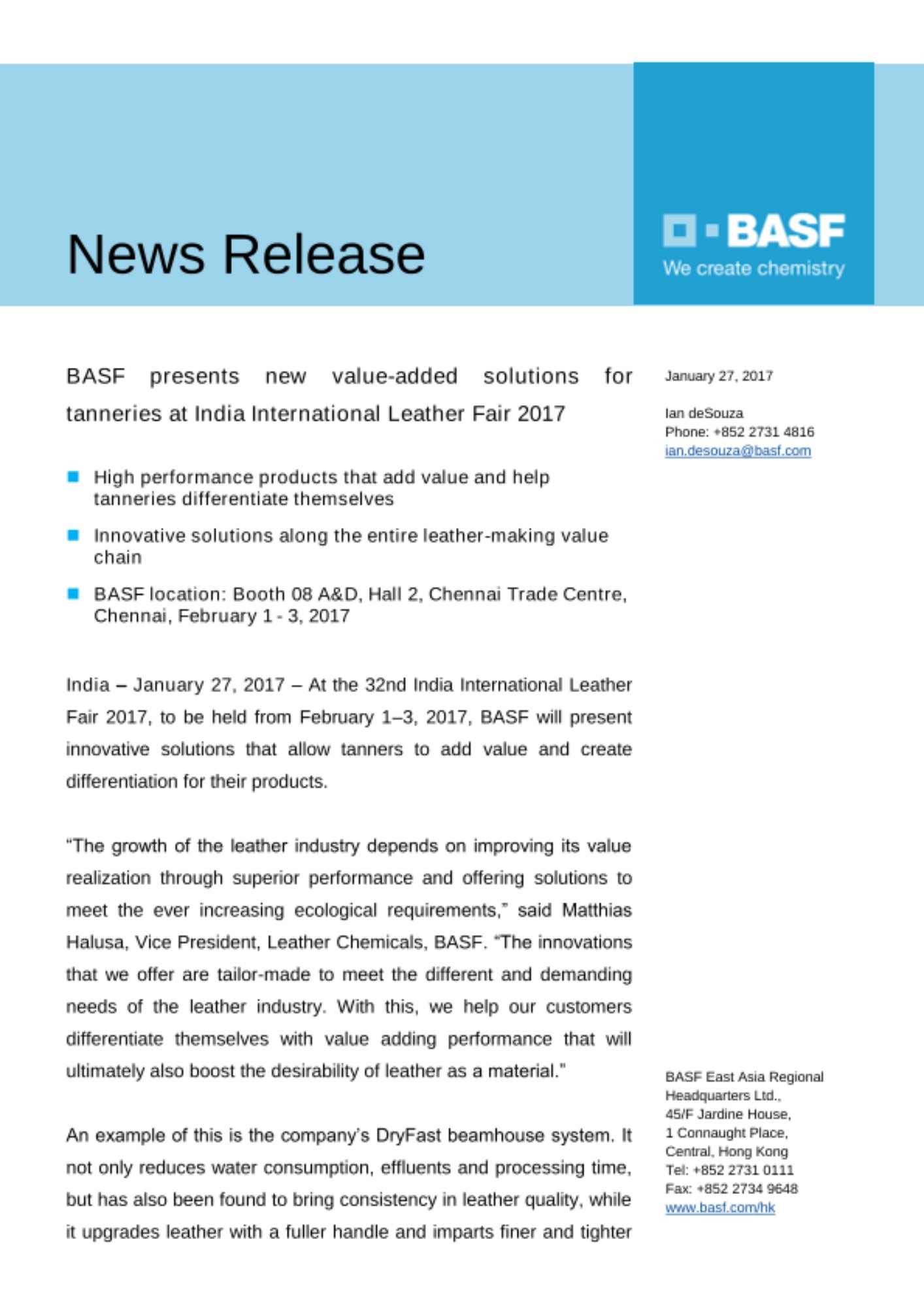 India – January 27, 2017 – At the 32nd India International Leather Fair 2017, to be held from February 1–3, 2017, BASF will present innovative solutions that allow tanners to add value and create differentiation for their products.