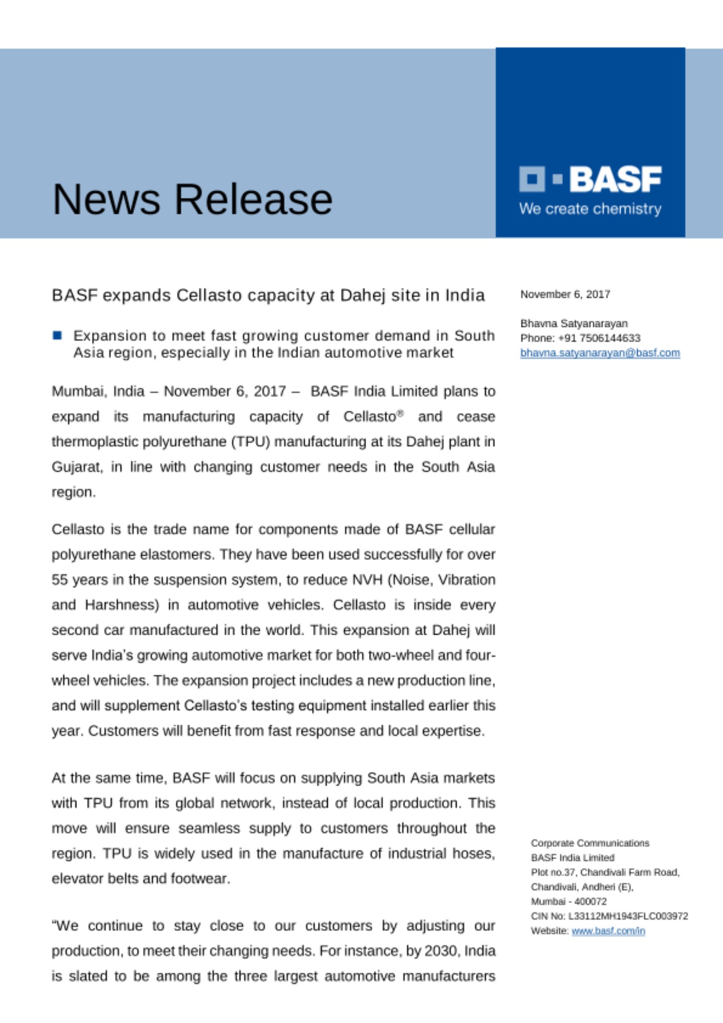 Mumbai, India – November 6, 2017 – BASF India Limited plans to expand its manufacturing capacity of Cellasto® and cease thermoplastic polyurethane (TPU) manufacturing at its Dahej plant in Gujarat, in line with changing customer needs in the South Asia region.
