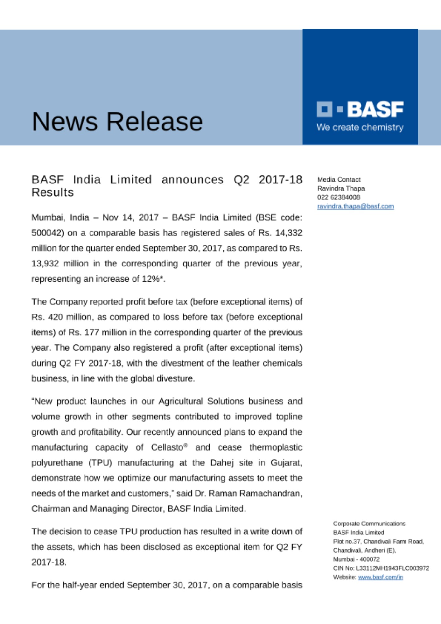 BASF India Limited announces Q2 2017-18 Results