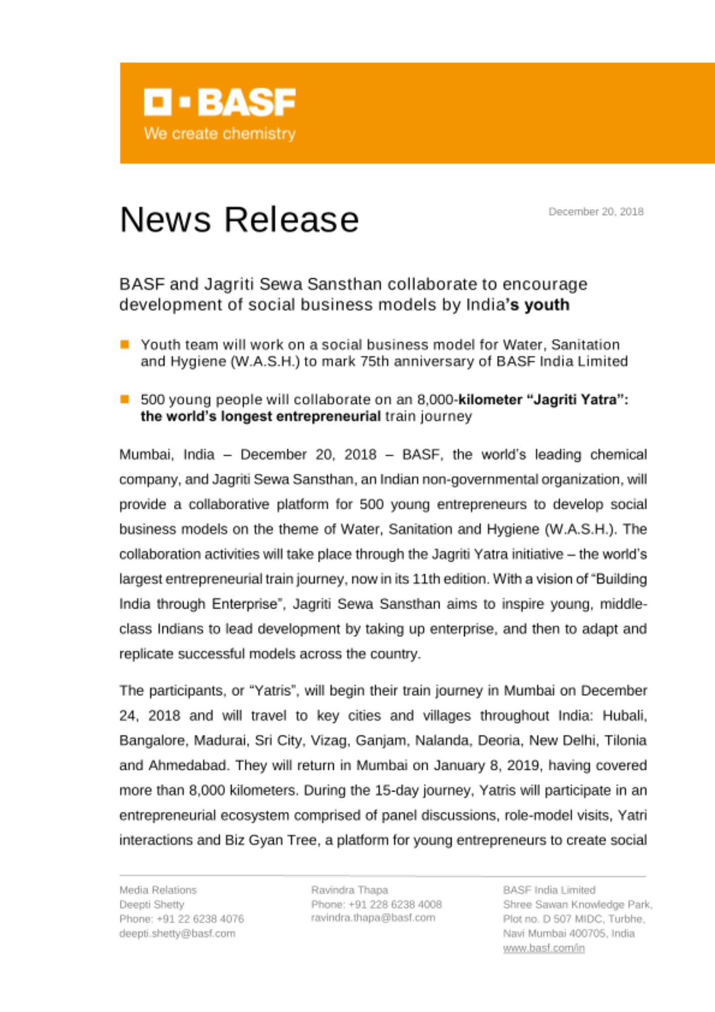 Mumbai, India – December 20, 2018 – BASF, the world’s leading chemical company, and Jagriti Sewa Sansthan, an Indian non-governmental organization, will provide a collaborative platform for 500 young entrepreneurs to develop social business models on the theme of Water, Sanitation and Hygiene (W.A.S.H.). The collaboration activities will take place through the Jagriti Yatra initiative – the world’s largest entrepreneurial train journey, now in its 11th edition. With a vision of “Building India through Enterprise”, Jagriti Sewa Sansthan aims to inspire young, middle-class Indians to lead development by taking up enterprise, and then to adapt and replicate successful models across the country.