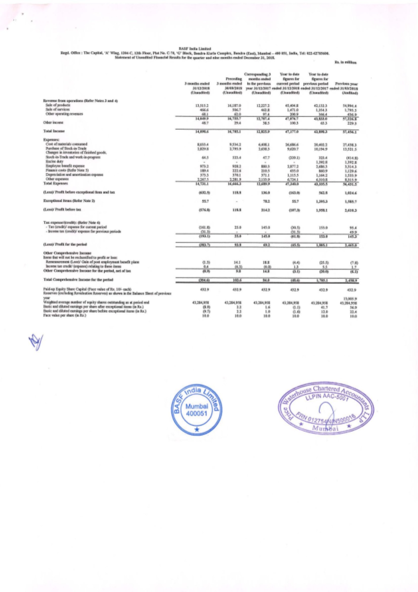 Mumbai, India – January 23, 2019 – BASF India Limited registered sales of Rs. 14,050 million for the quarter ended December 31, 2018, as compared to Rs. 12,787 million in the corresponding quarter of the previous year, representing an increase of 10%. The Company reported Loss Before Tax (after exceptional items) of Rs. 577 million, as compared to Profit Before Tax (after exceptional items) of Rs. 214 million in the corresponding quarter of the previous year.