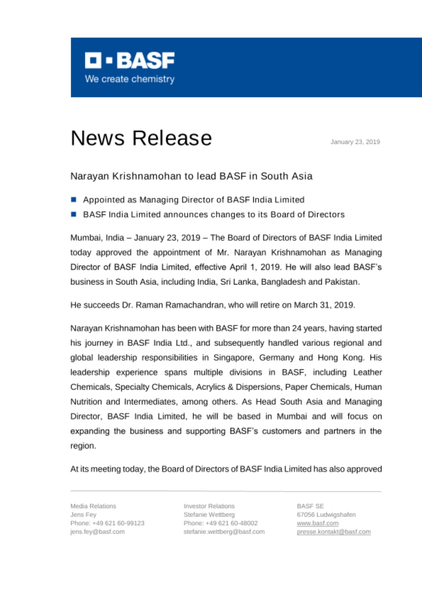 Mumbai, India – January 23, 2019 – The Board of Directors of BASF India Limited today approved the appointment of Mr. Narayan Krishnamohan as Managing Director of BASF India Limited, effective April 1, 2019. He will also lead BASF’s business in South Asia, including India, Sri Lanka, Bangladesh and Pakistan.