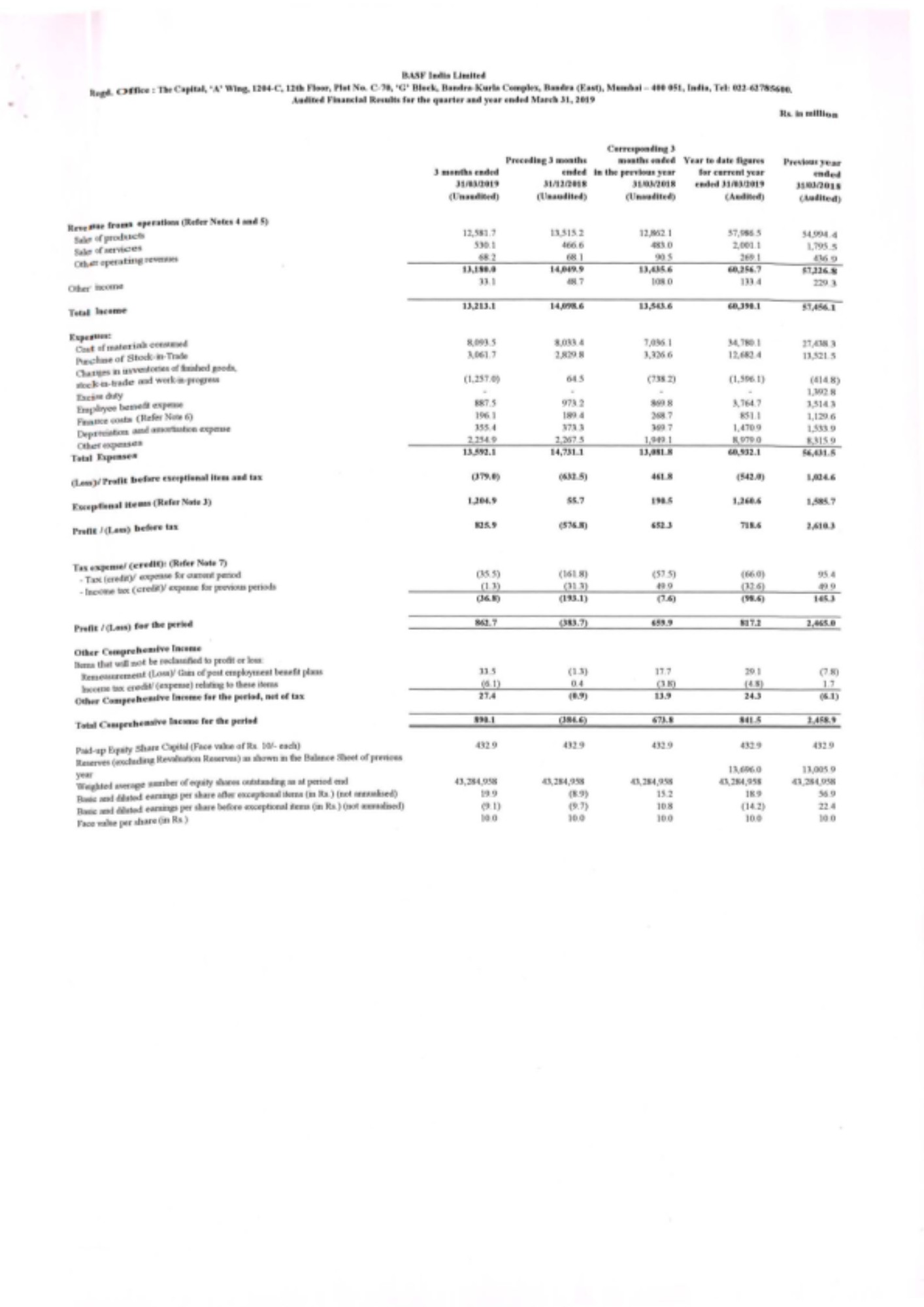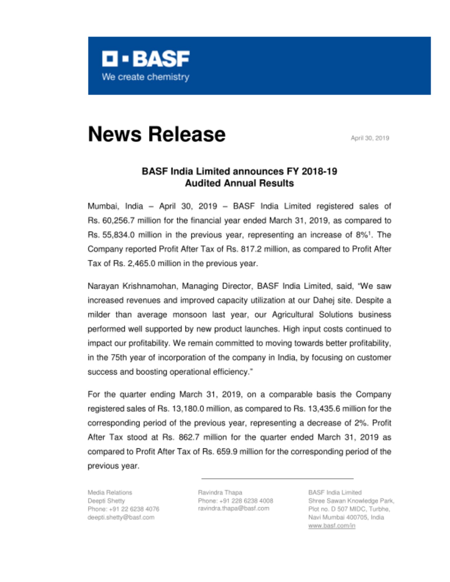 Mumbai, India – April 30, 2019 – BASF India Limited registered sales of Rs. 60,256.7 million for the financial year ended March 31, 2019, as compared to Rs. 55,834.0 million in the previous year, representing an increase of 8%1. The Company reported Profit After Tax of Rs. 817.2 million, as compared to Profit After Tax of Rs. 2,465.0 million in the previous year.