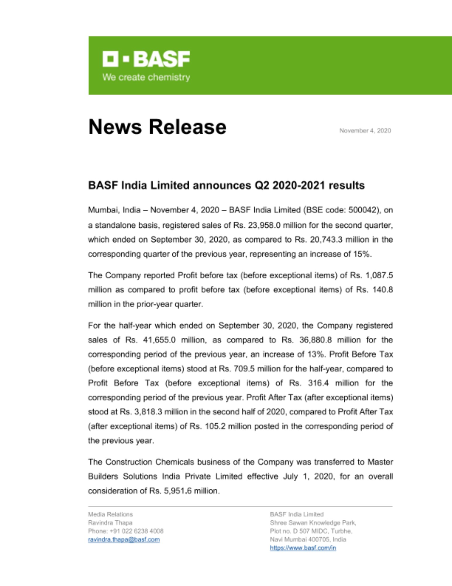 Mumbai, India – November 4, 2020 – BASF India Limited (BSE code: 500042), on a standalone basis, registered sales of Rs. 23,958.0 million for the second quarter, which ended on September 30, 2020, as compared to Rs. 20,743.3 million in the corresponding quarter of the previous year, representing an increase of 15%.