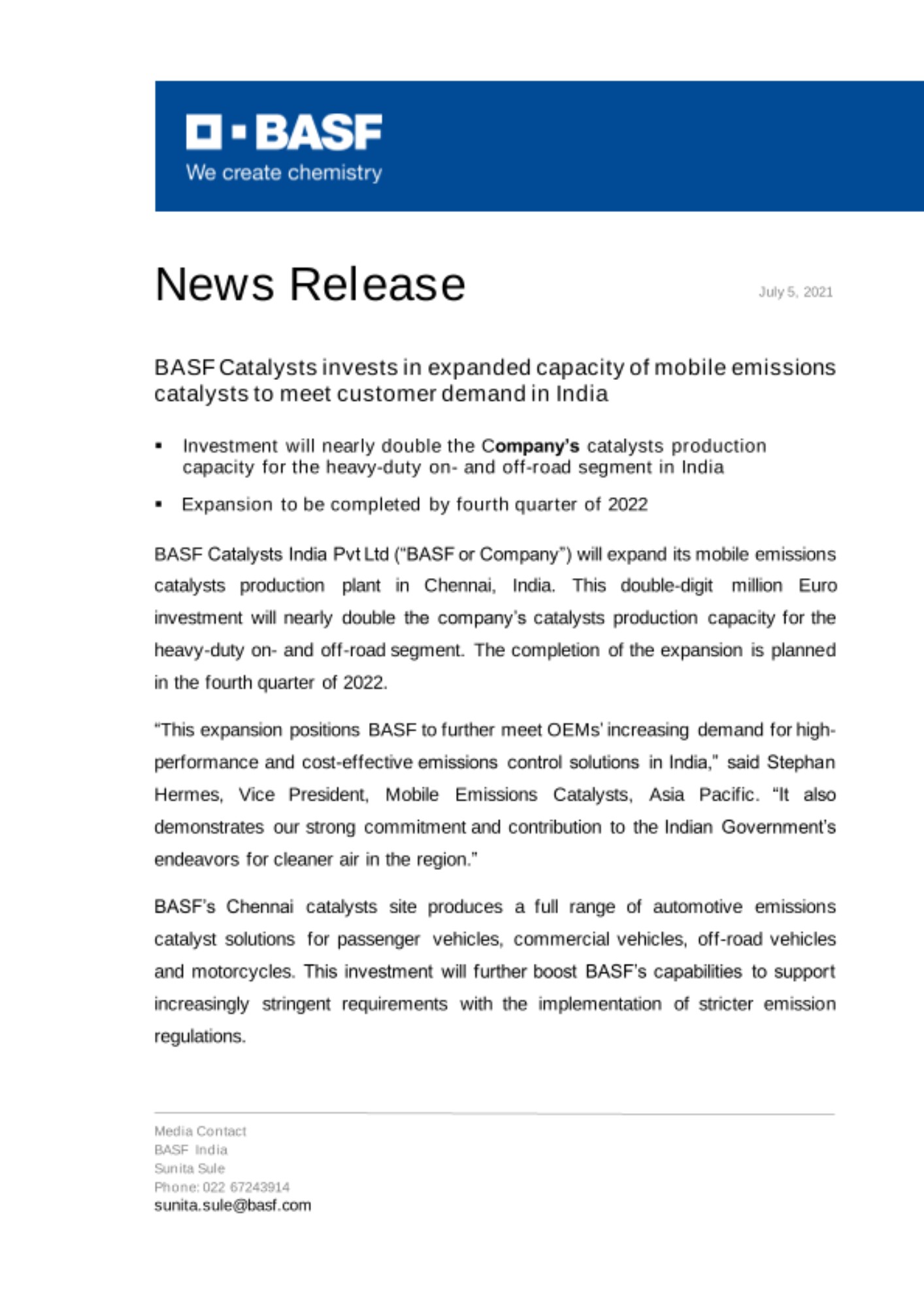 “This expansion positions BASF to further meet OEMs’ increasing demand for high-performance and cost-effective emissions control solutions in India,” said Stephan Hermes, Vice President, Mobile Emissions Catalysts, Asia Pacific. “It also demonstrates our strong commitment and contribution to the Indian Government’s endeavors for cleaner air in the region.”