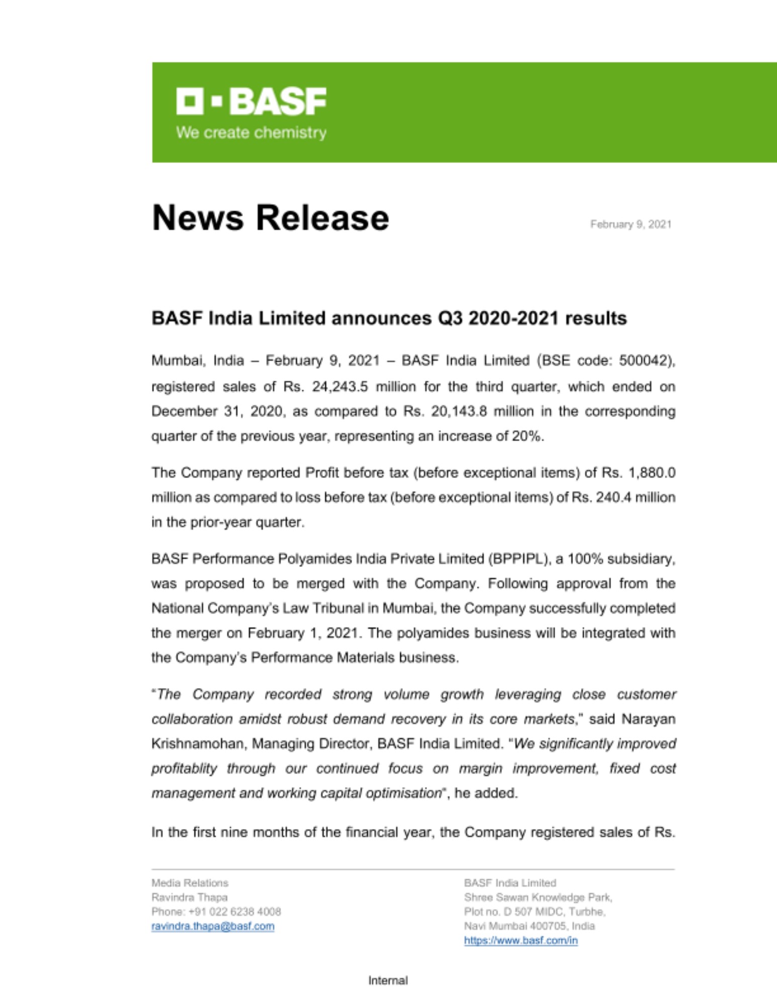 Mumbai, India – February 9, 2021 – BASF India Limited (BSE code: 500042), registered sales of Rs. 24,243.5 million for the third quarter, which ended on December 31, 2020, as compared to Rs. 20,143.8 million in the corresponding quarter of the previous year, representing an increase of 20%.