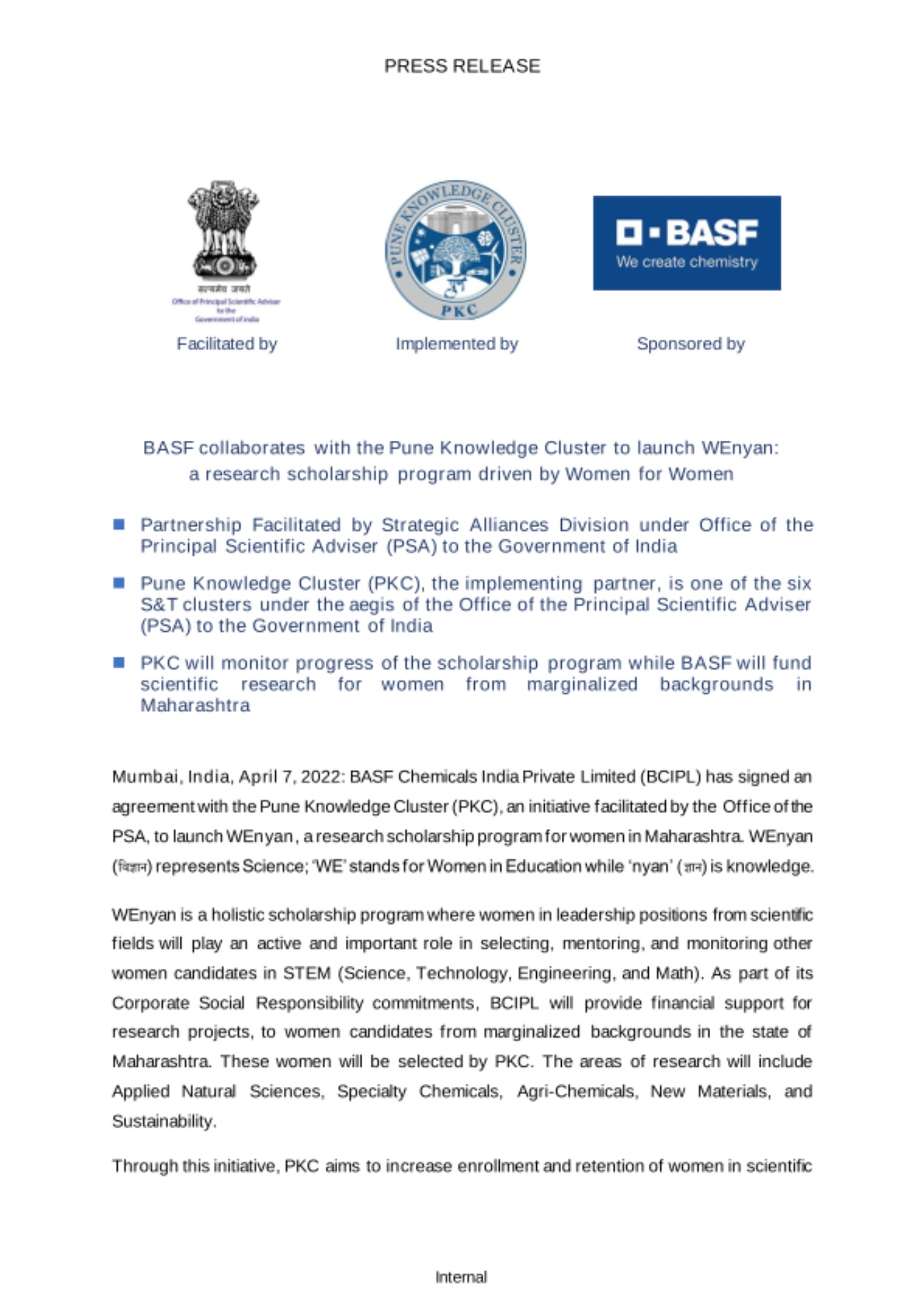 Mumbai, India, April 7, 2022: BASF Chemicals India Private Limited (BCIPL) has signed an agreement with the Pune Knowledge Cluster (PKC), an initiative facilitated by the Office of the PSA, to launch WEnyan, a research scholarship program for women in Maharashtra. WEnyan (विज्ञान) represents Science; ‘WE’ stands for Women in Education while ‘nyan’ (ज्ञान) is knowledge.