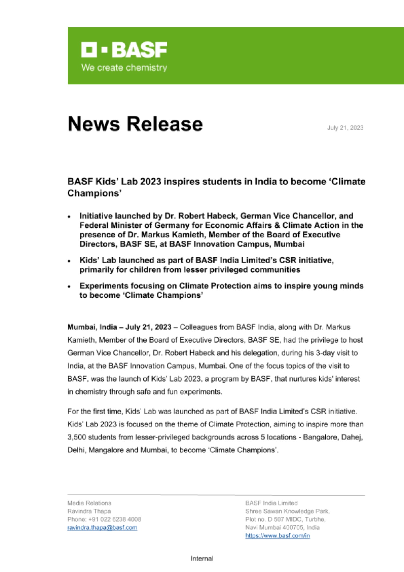 - Initiative launched by Dr. Robert Habeck, German Vice Chancellor, and Federal Minister of Germany for Economic Affairs & Climate Action in the presence of Dr. Markus Kamieth, Member of the Board of Executive Directors, BASF SE, at BASF Innovation Campus, Mumbai