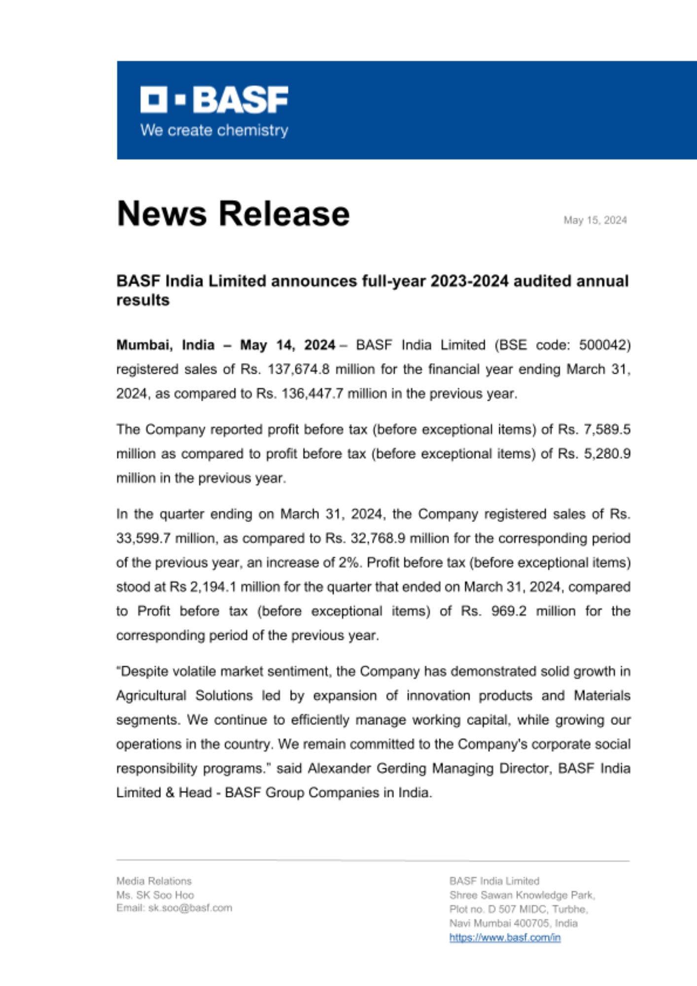 Mumbai, India – May 14, 2024 – BASF India Limited (BSE code: 500042) registered sales of Rs. 137,674.8 million for the financial year ending March 31, 2024, as compared to Rs. 136,447.7 million in the previous year.