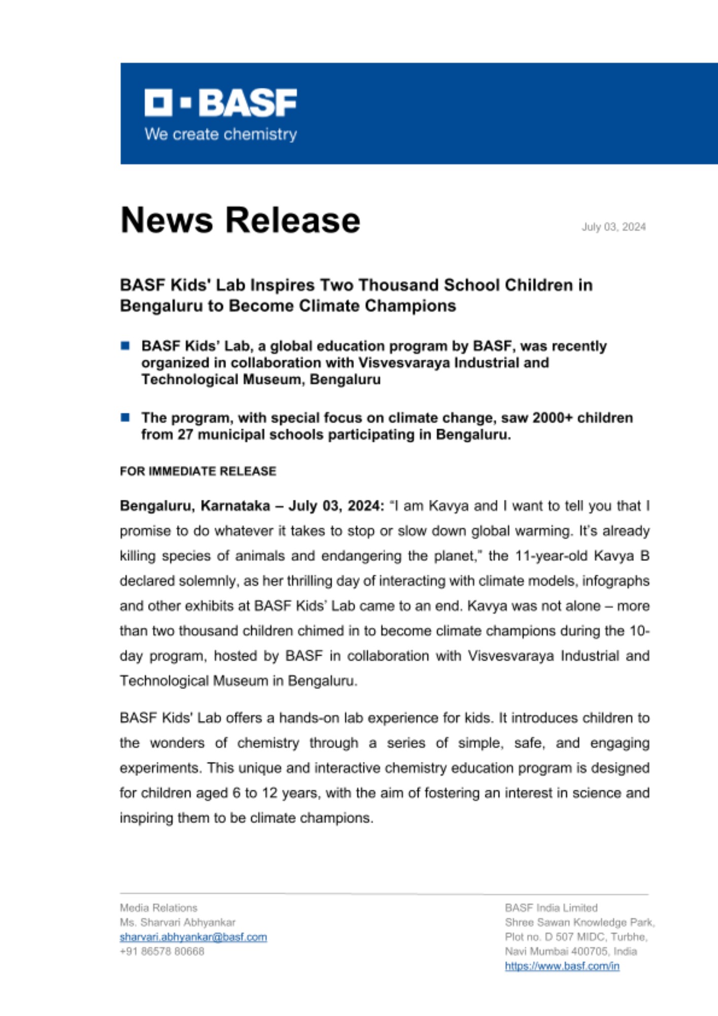 The program has been a resounding success, with more than six thousand children attending the Bengaluru event as well as two previous events held in Navi Mumbai in July 2023 and Mangalore in January 2024. "We believe that by instilling a passion for science and environmental stewardship at a young age, we can empower children to make a positive impact on our planet," says Alexander Gerding, Managing Director of BASF India Limited. “Since the launch of BASF Kids’ Lab in 2004, the fact that we could reach and engage 50,000+ students and their teachers across India speaks clearly about the program’s success and BASF’s commitment to education, sustainability and the future generations,” he adds.