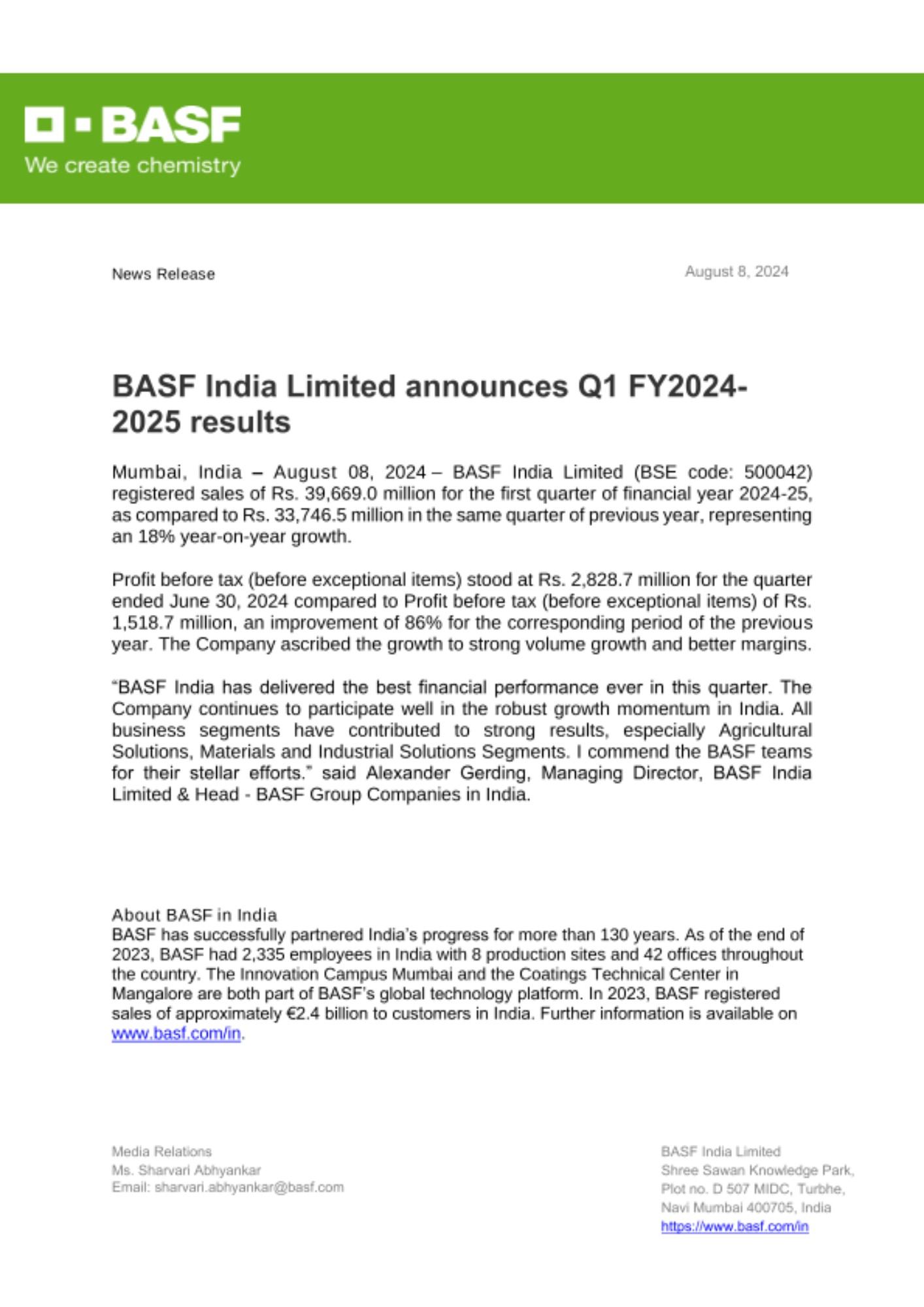 Mumbai, India – August 08, 2024 – BASF India Limited (BSE code: 500042) registered sales of Rs. 39,669.0 million for the first quarter of financial year 2024-25, as compared to Rs. 33,746.5 million in the same quarter of previous year, representing an 18% year-on-year growth.