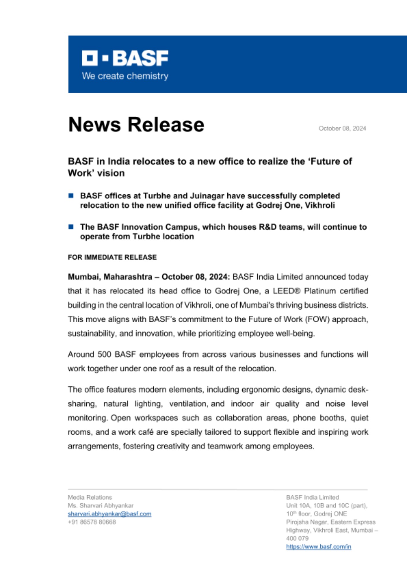 Mumbai, Maharashtra – October 08, 2024: BASF India Limited announced today that it has relocated its head office to Godrej One, a LEED®️ Platinum certified building in the central location of Vikhroli, one of Mumbai's thriving business districts. This move aligns with BASF’s commitment to the Future of Work (FOW) approach, sustainability, and innovation, while prioritizing employee well-being.