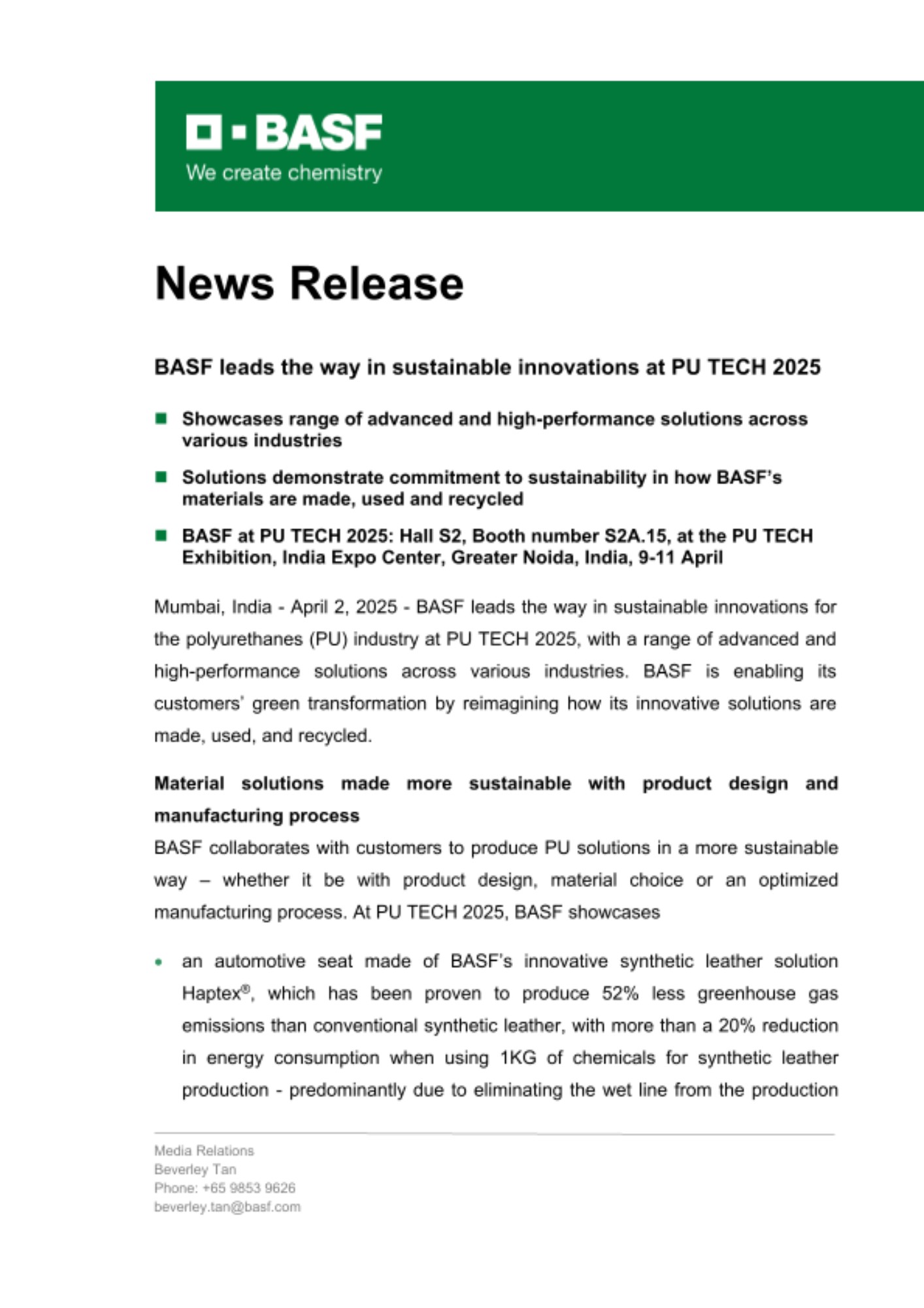 Mumbai, India - April 2, 2025 - BASF leads the way in sustainable innovations for the polyurethanes (PU) industry at PU TECH 2025, with a range of advanced and high-performance solutions across various industries. BASF is enabling its customers’ green transformation by reimagining how its innovative solutions are made, used, and recycled.