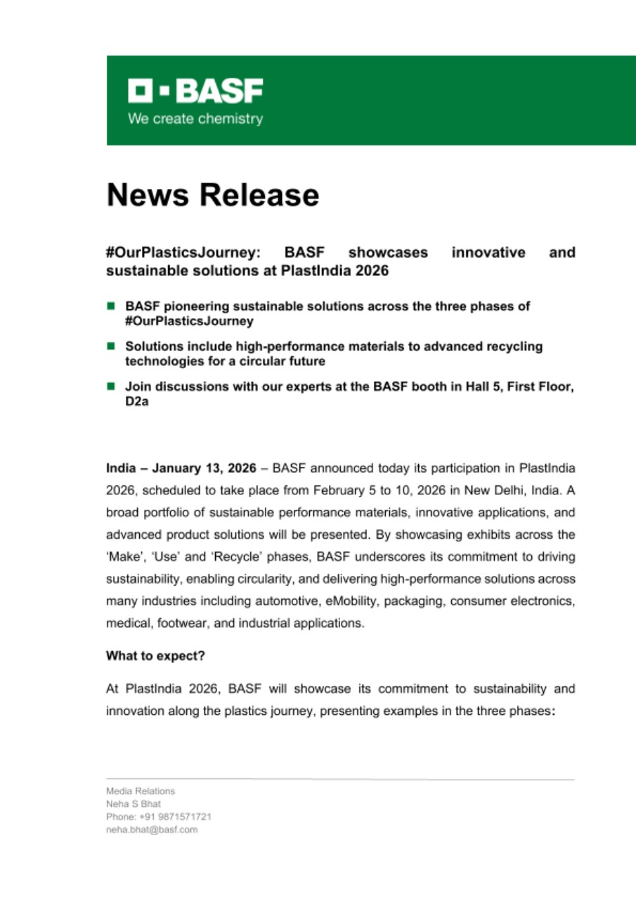 India – January 13, 2026 – BASF announced today its participation in PlastIndia 2026, scheduled to take place from February 5 to 10, 2026 in New Delhi, India. A broad portfolio of sustainable performance materials, innovative applications, and advanced product solutions will be presented. By showcasing exhibits across the ‘Make’, ‘Use’ and ‘Recycle’ phases, BASF underscores its commitment to driving sustainability, enabling circularity, and delivering high-performance solutions across many industries including automotive, eMobility, packaging, consumer electronics, medical, footwear, and industrial applications.
