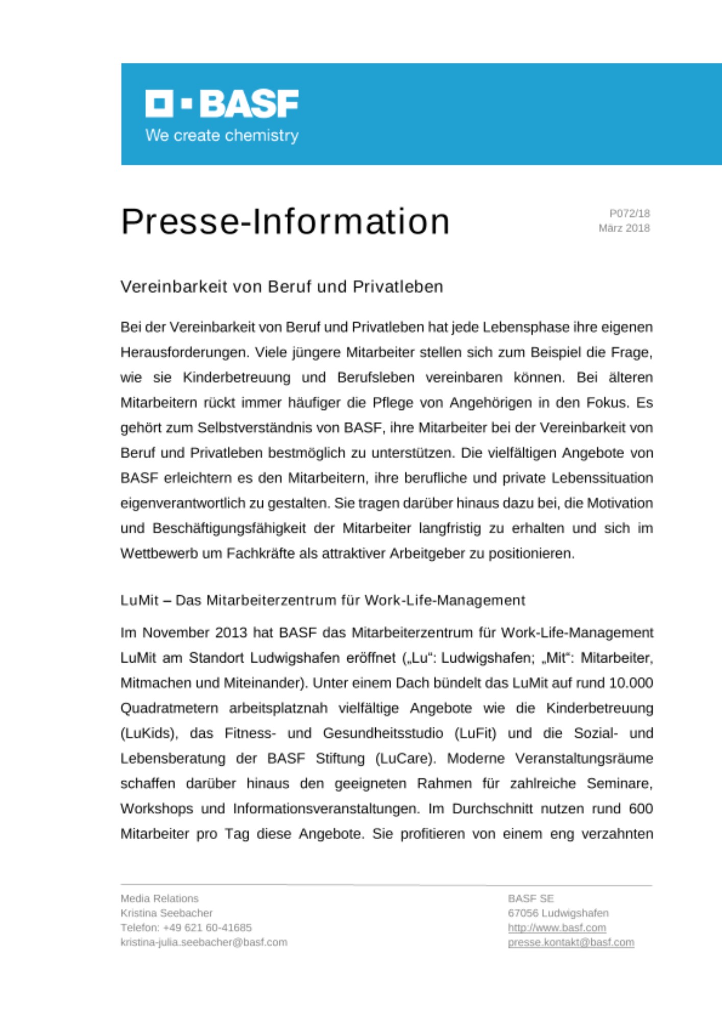 Many younger employees, for example, ask themselves how they will be able to combine child care and professional life. For older employees, the care of relatives becomes more and more important. With numerous offerings, BASF enables employees to find better ways of reconciling the challenges of everyday life and shows them that private life and professional commitment are not mutually exclusive.