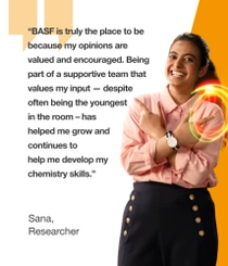 Sana combines her passion for sustainability with her love for chemistry. From an early age, she advocated for environmental choices, which sparked her curiosity about designing sustainable molecules. As a researcher at BASF, Sana creates sustainable alternatives by synthesizing innovative, new molecules, seeing her ideas come to life in the lab. She values BASF's commitment to sustainability, as it aligns with her personal mission to reduce environmental impact. Sana thrives in BASF's collaborative environment, where her ideas are cherished and her experience in chemistry continues to grow.
