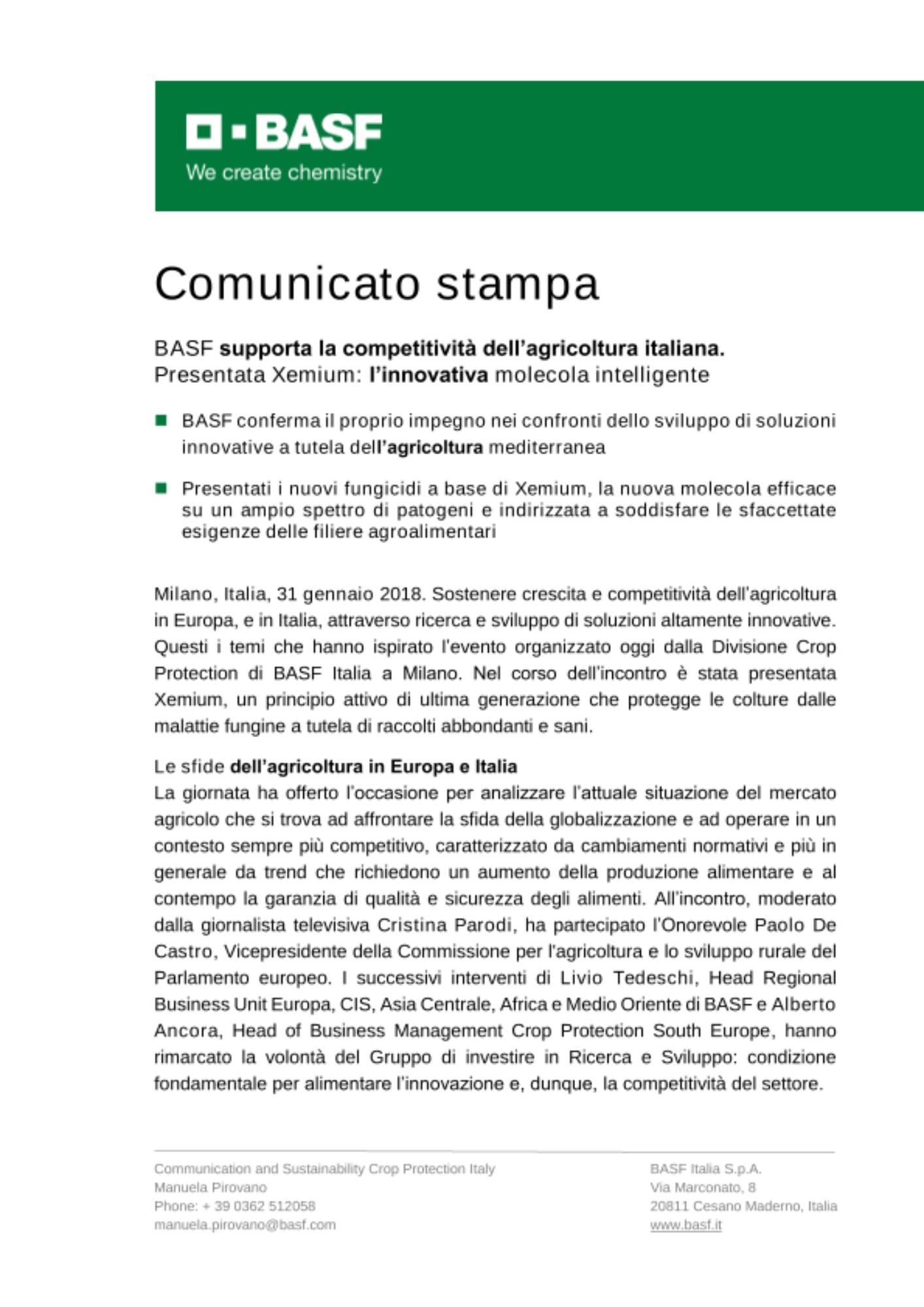 Milano, Italia, 31 gennaio 2018. Sostenere crescita e competitività dell’agricoltura in Europa, e in Italia, attraverso ricerca e sviluppo di soluzioni altamente innovative. Questi i temi che hanno ispirato l’evento organizzato oggi dalla Divisione Crop Protection di BASF Italia a Milano. Nel corso dell’incontro è stata presentata Xemium, un principio attivo di ultima generazione che protegge le colture dalle malattie fungine a tutela di raccolti abbondanti e sani.