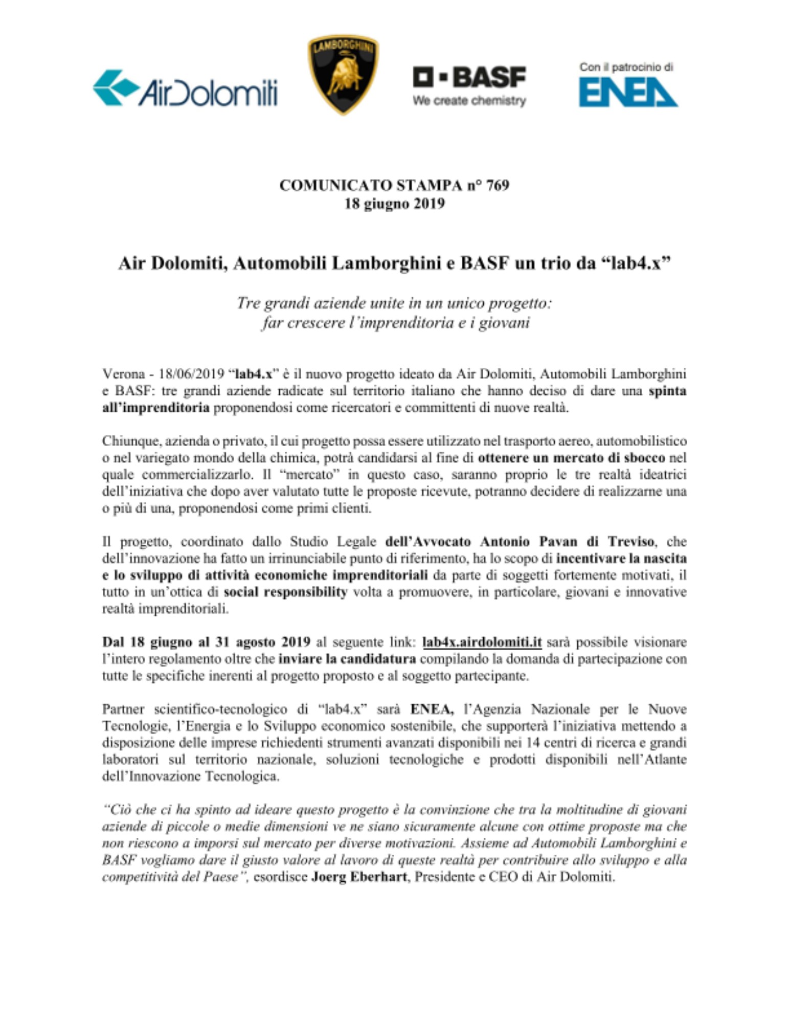 Cesano Maderno, 20 giugno 2019 - “lab4.x” è il nuovo progetto ideato da Air Dolomiti, Automobili Lamborghini e BASF: tre grandi aziende radicate sul territorio italiano che hanno deciso di dare una spinta all’imprenditoria proponendosi come ricercatori e committenti di nuove realtà.