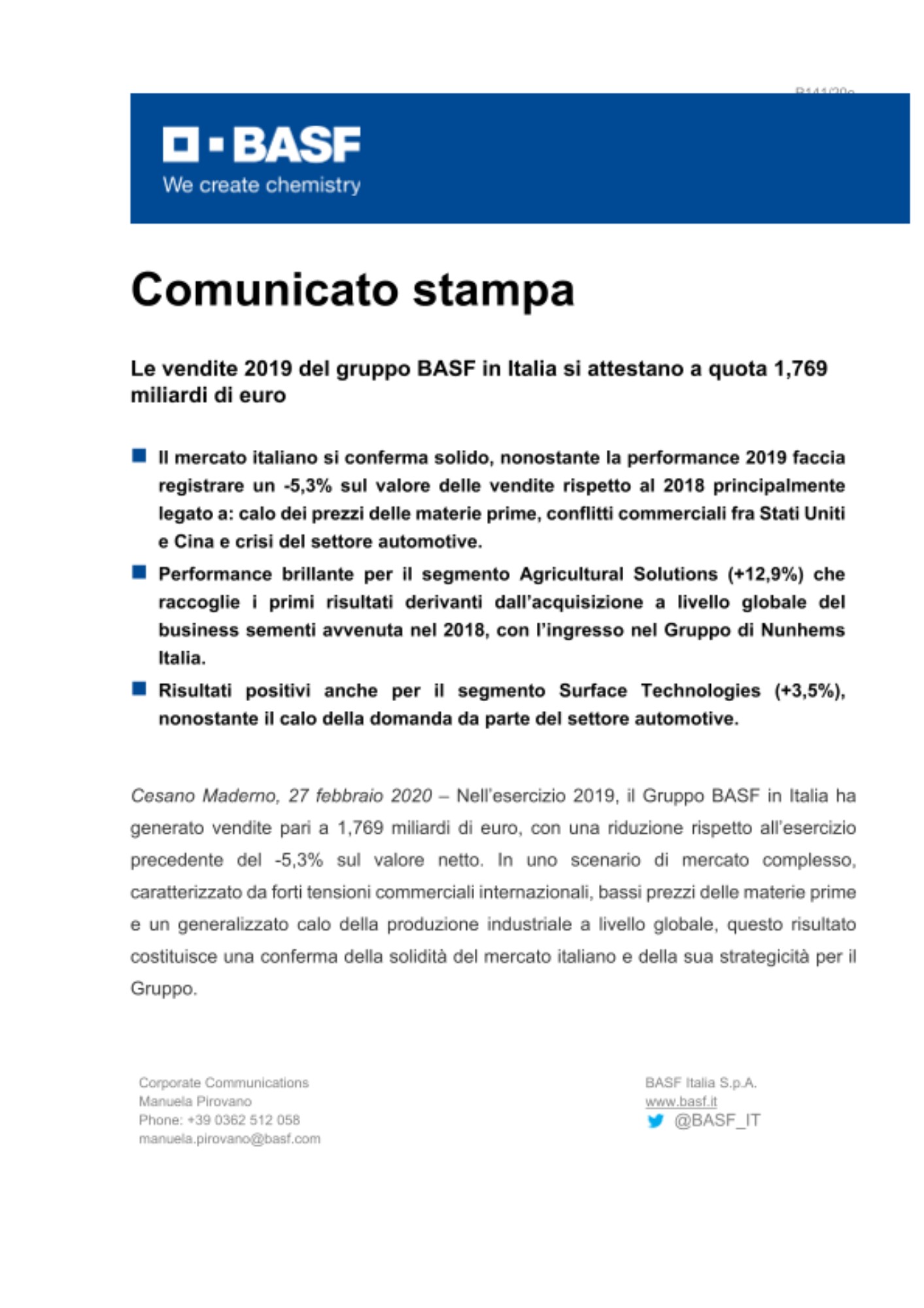 Cesano Maderno, 27 febbraio 2020 – Nell’esercizio 2019, il Gruppo BASF in Italia ha generato vendite pari a 1,769 miliardi di euro, con una riduzione rispetto all’esercizio precedente del -5,3% sul valore netto. In uno scenario di mercato complesso, caratterizzato da forti tensioni commerciali internazionali, bassi prezzi delle materie prime e un generalizzato calo della produzione industriale a livello globale, questo risultato costituisce una conferma della solidità del mercato italiano e della sua strategicità per il Gruppo.