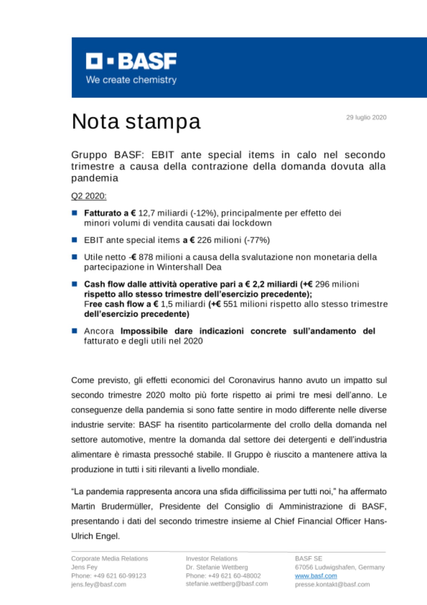 Come previsto, gli effetti economici del Coronavirus hanno avuto un impatto sul secondo trimestre 2020 molto più forte rispetto ai primi tre mesi dell’anno. Le conseguenze della pandemia si sono fatte sentire in modo differente nelle diverse industrie servite: BASF ha risentito particolarmente del crollo della domanda nel settore automotive, mentre la domanda dal settore dei detergenti e dell’industria alimentare è rimasta pressoché stabile. Il Gruppo è riuscito a mantenere attiva la produzione in tutti i siti rilevanti a livello mondiale.