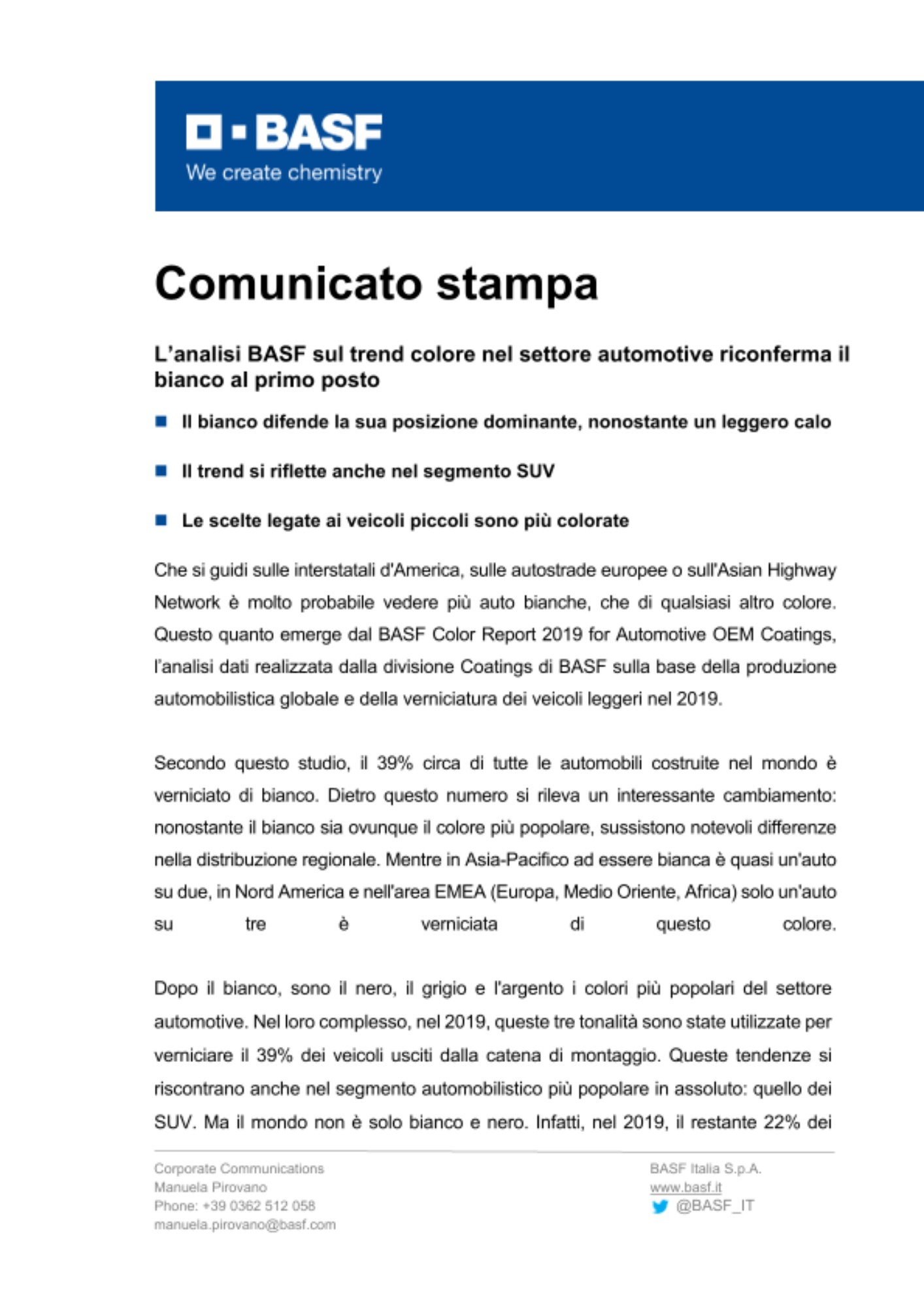 Che si guidi sulle interstatali d'America, sulle autostrade europee o sull'Asian Highway Network è molto probabile vedere più auto bianche, che di qualsiasi altro colore. Questo quanto emerge dal BASF Color Report 2019 for Automotive OEM Coatings, l’analisi dati realizzata dalla divisione Coatings di BASF sulla base della produzione automobilistica globale e della verniciatura dei veicoli leggeri nel 2019.