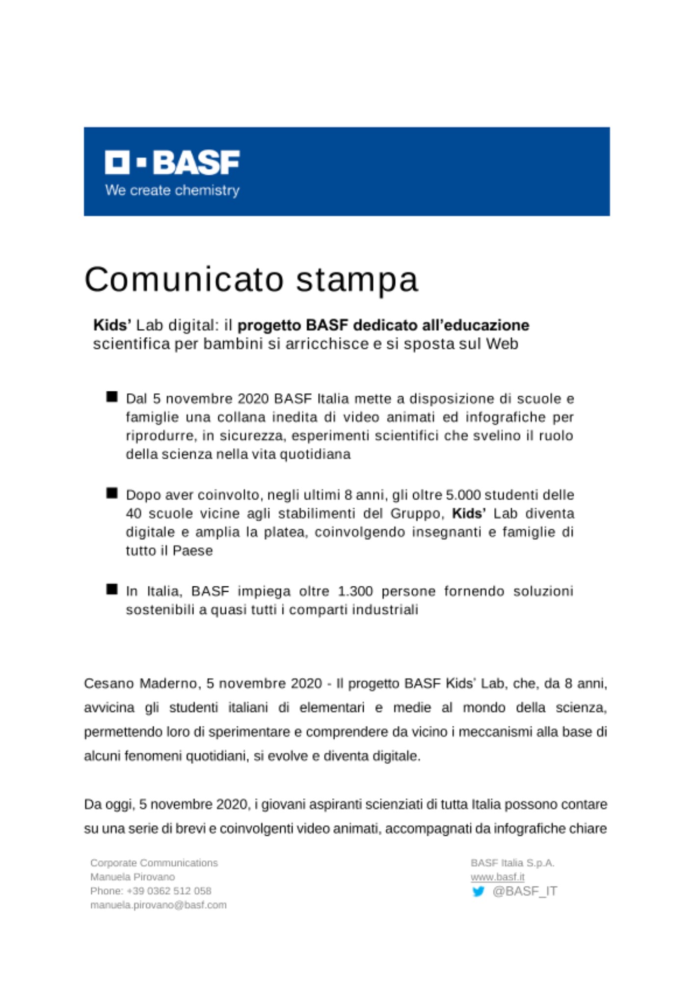 - Dal 5 novembre 2020 BASF Italia mette a disposizione di scuole e famiglie una collana inedita di video animati ed infografiche per riprodurre, in sicurezza, esperimenti scientifici che svelino il ruolo della scienza nella vita quotidiana