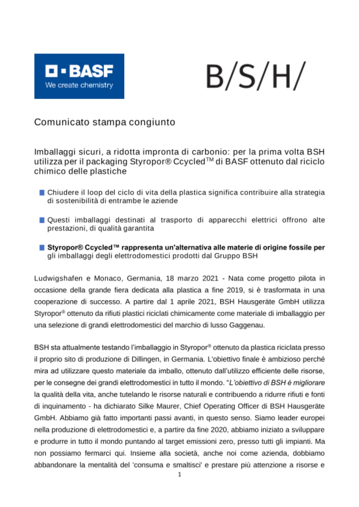 BSH sta attualmente testando l’imballaggio in Styropor® ottenuto da plastica riciclata presso il proprio sito di produzione di Dillingen, in Germania. L'obiettivo finale è ambizioso perché mira ad utilizzare questo materiale da imballo, ottenuto dall’utilizzo efficiente delle risorse, per le consegne dei grandi elettrodomestici in tutto il mondo. “L’obiettivo di BSH è migliorare la qualità della vita, anche tutelando le risorse naturali e contribuendo a ridurre rifiuti e fonti di inquinamento - ha dichiarato Silke Maurer, Chief Operating Officer di BSH Hausgeräte GmbH. Abbiamo già fatto importanti passi avanti, in questo senso. Siamo leader europei nella produzione di elettrodomestici e, a partire da fine 2020, abbiamo iniziato a sviluppare e produrre in tutto il mondo puntando al target emissioni zero, presso tutti gli impianti. Ma non possiamo fermarci qui. Insieme alla società, anche noi come azienda, dobbiamo abbandonare la mentalità del 'consuma e smaltisci' e prestare più attenzione a risorse e materiali. Trasformare qualcosa di usato in qualcosa di nuovo prevenendo gli sprechi è un passaggio essenziale dell'approccio di BSH all'economia circolare. Utilizzando gli imballaggi in Styropor® ottenuto da materie prime provenienti dal riciclo chimico, noi contribuiamo attivamente ai nostri obiettivi di sostenibilità e all'economia circolare, a livello di settore. Siamo felici di collaborare con BASF, un partner esperto e al nostro fianco ormai da anni che saprà aiutarci anche a raggiungere questi obiettivi".