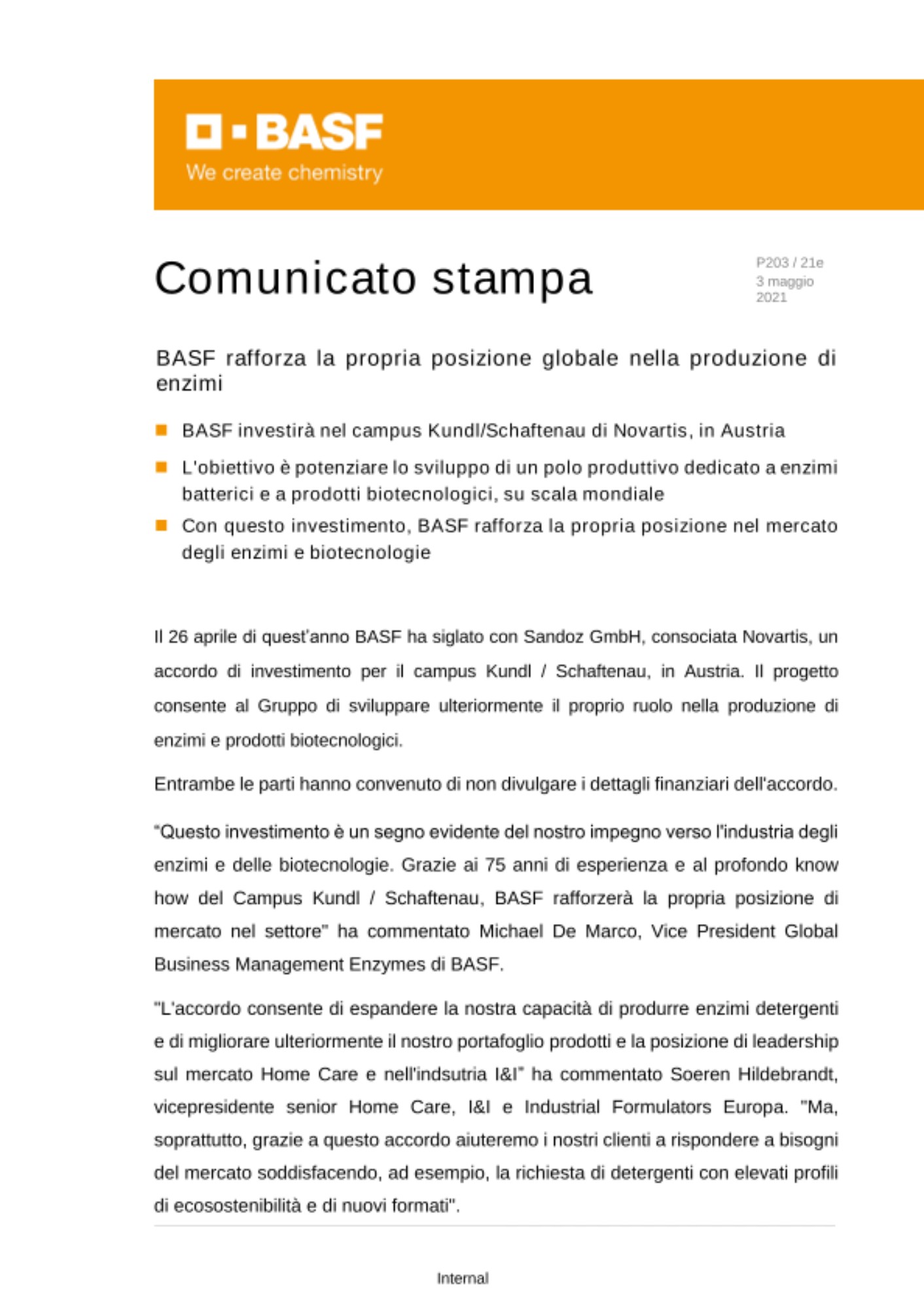 - Con questo investimento, BASF rafforza la propria posizione nel mercato degli enzimi e biotecnologie
