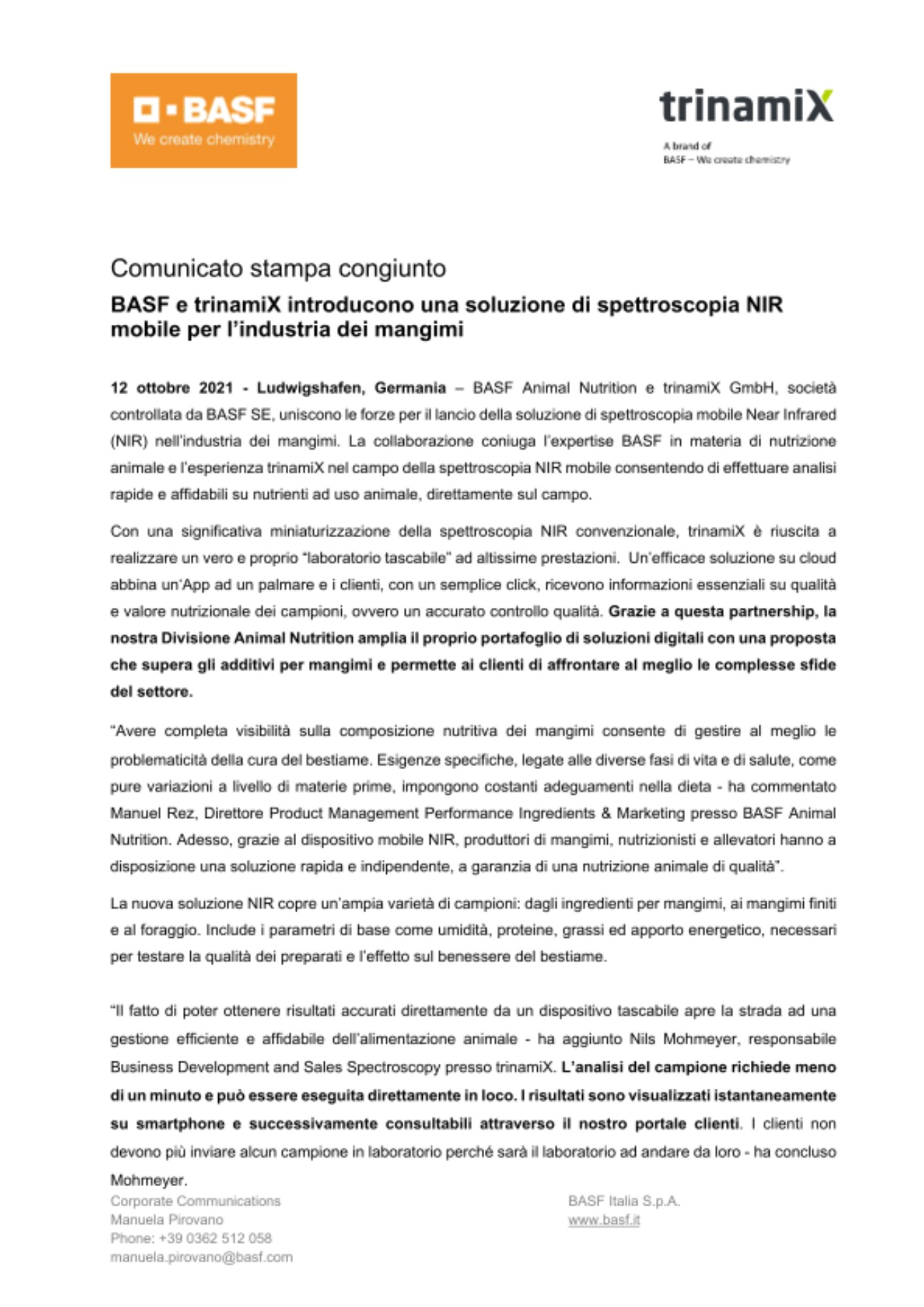 12 ottobre 2021 - Ludwigshafen, Germania – BASF Animal Nutrition e trinamiX GmbH, società controllata da BASF SE, uniscono le forze per il lancio della soluzione di spettroscopia mobile Near Infrared (NIR) nell’industria dei mangimi. La collaborazione coniuga l’expertise BASF in materia di nutrizione animale e l’esperienza trinamiX nel campo della spettroscopia NIR mobile consentendo di effettuare analisi rapide e affidabili su nutrienti ad uso animale, direttamente sul campo.