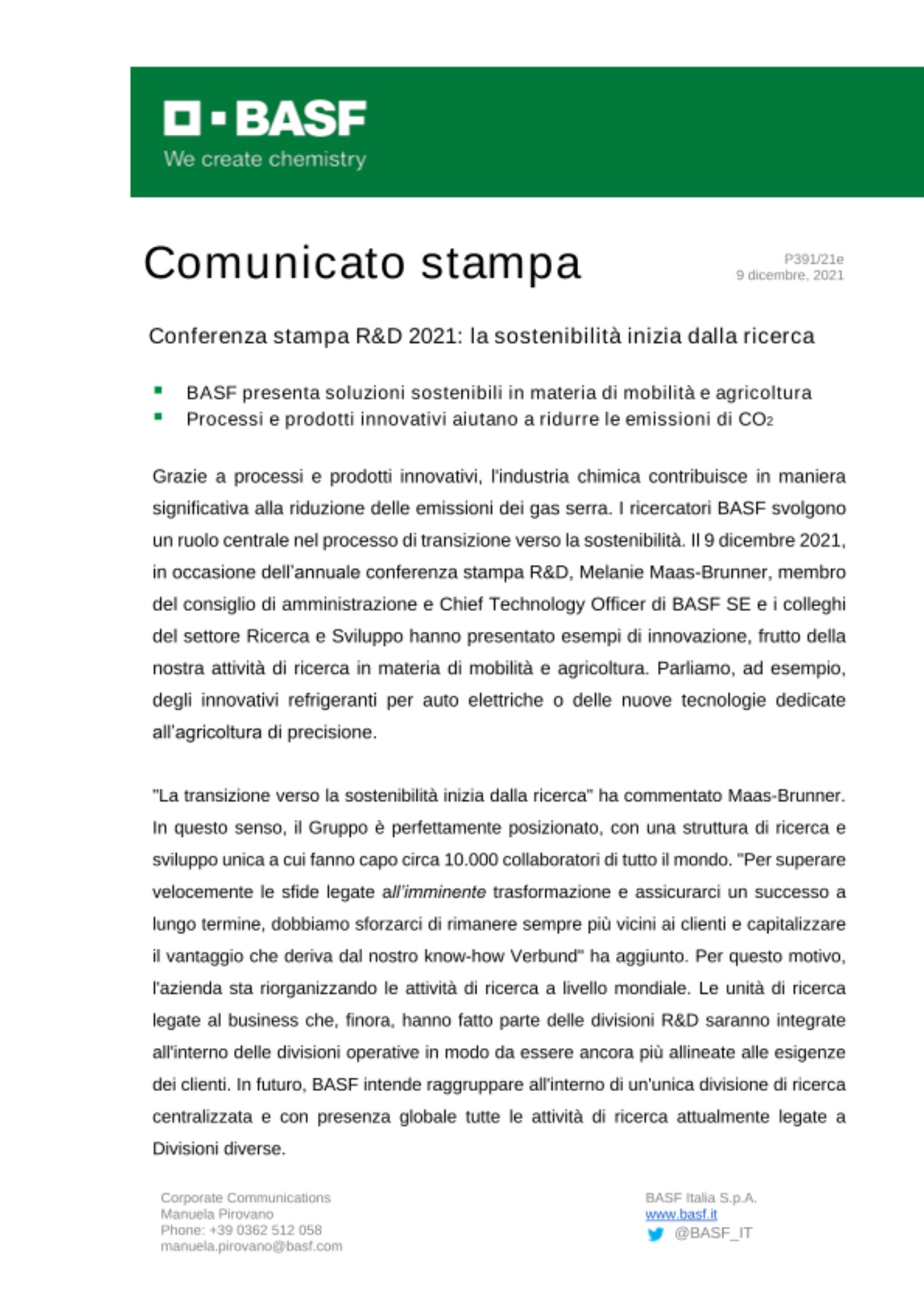Ulteriori informazioni sulle presentazioni condivise durante la conferenza stampa del 9.12.21 sono disponibili all'indirizzo: basf.com/research-press-conference