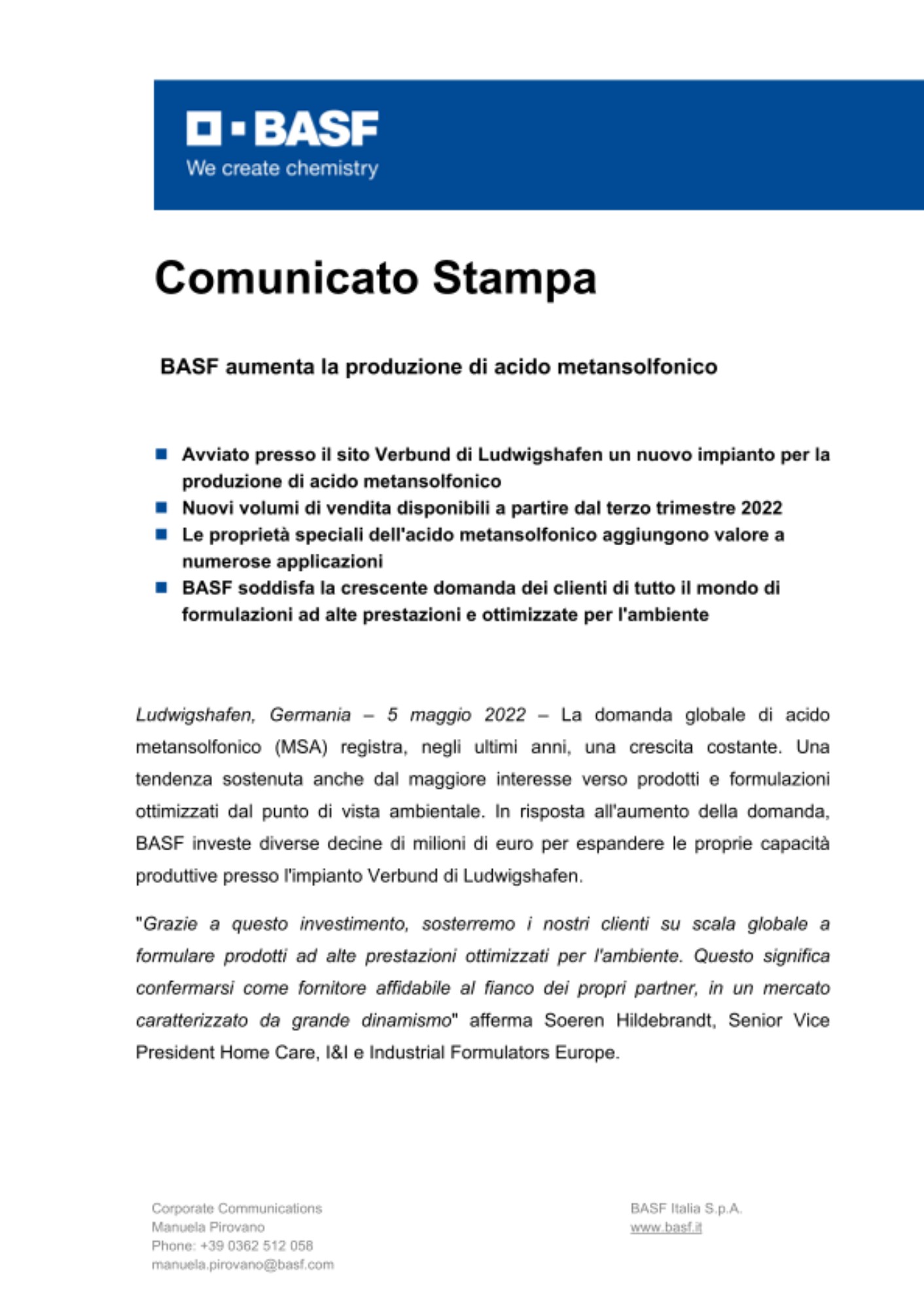 La domanda globale di acido metansolfonico (MSA) registra, negli ultimi anni, una crescita costante. Una tendenza sostenuta anche dal maggiore interesse verso prodotti e formulazioni ottimizzati dal punto di vista ambientale. In risposta all'aumento della domanda, BASF investe diverse decine di milioni di euro per espandere le proprie capacità produttive presso l'impianto Verbund di Ludwigshafen.