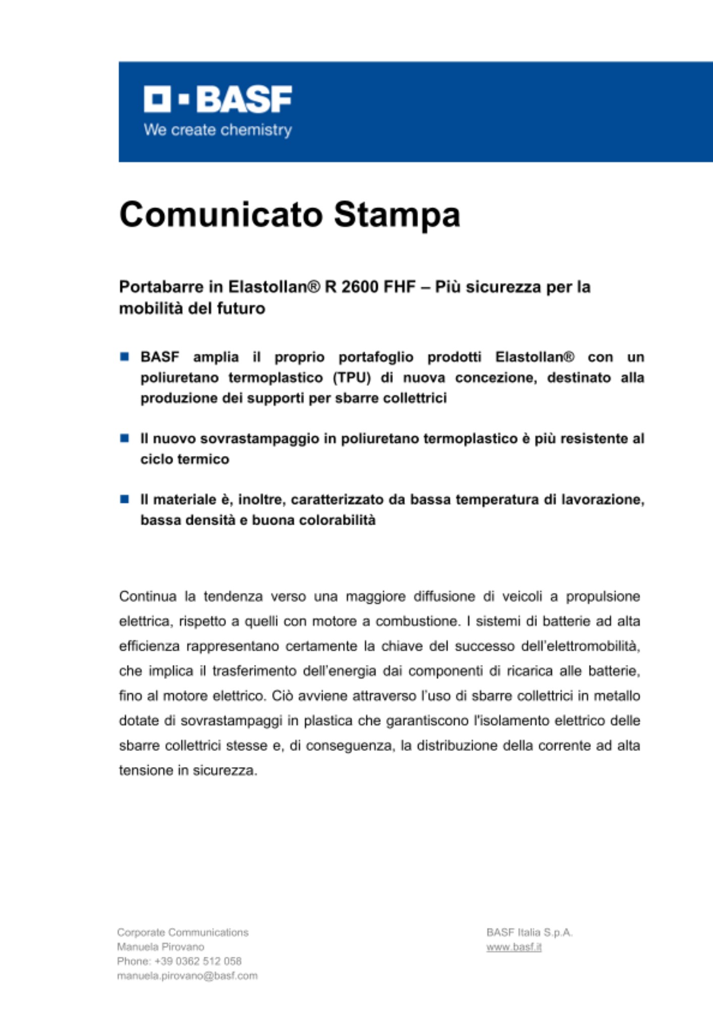 - BASF amplia il proprio portafoglio prodotti Elastollan® con un poliuretano termoplastico (TPU) di nuova concezione, destinato alla produzione dei supporti per sbarre collettrici