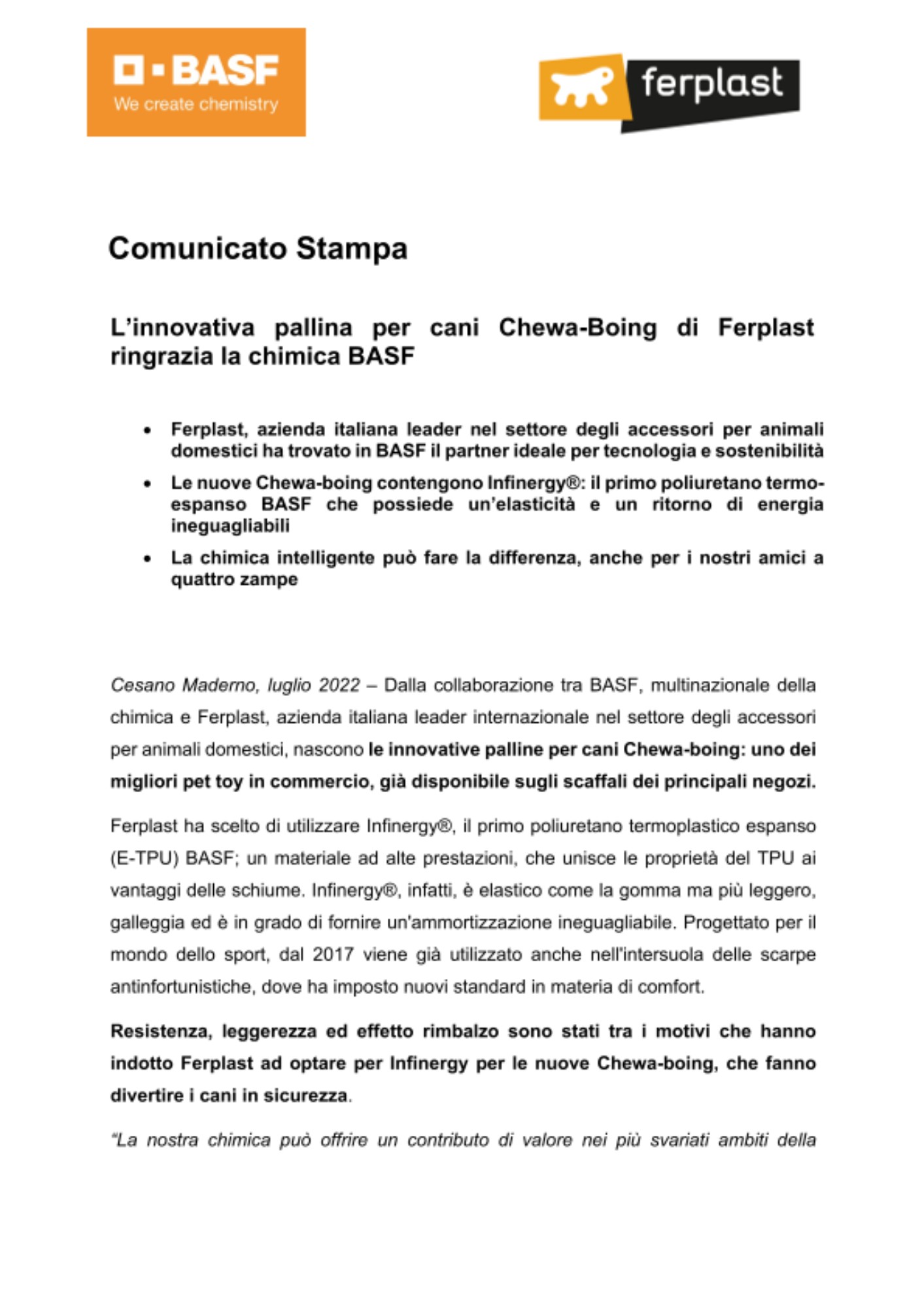 “La nostra chimica può offrire un contributo di valore nei più svariati ambiti della quotidianità, dando risposte concrete anche nel comparto dei pet toy - dichiara Maurizio Grieco, Account Manager PM Italia. Capace di resistere alle sollecitazioni, Infinergy® rende le Chewa-Boing resistentissime e sicure, ad ogni morso. Grazie al nostro poliuretano, inoltre, le nuove palline di Ferplast sono ideali anche al mare, poiché risultano leggerissime e galleggianti”.