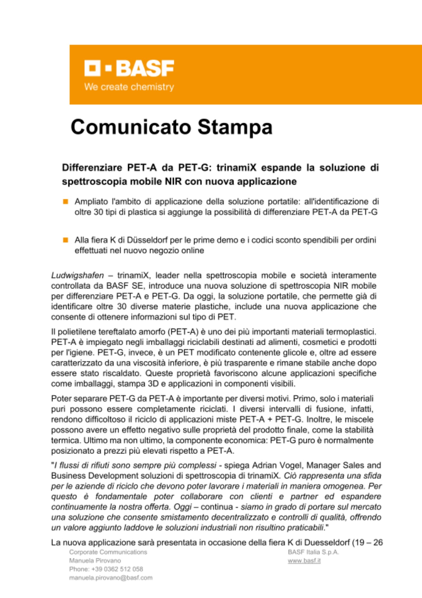 Ludwigshafen – trinamiX, leader nella spettroscopia mobile e società interamente controllata da BASF SE, introduce una nuova soluzione di spettroscopia NIR mobile per differenziare PET-A e PET-G. Da oggi, la soluzione portatile, che permette già di identificare oltre 30 diverse materie plastiche, include una nuova applicazione che consente di ottenere informazioni sul tipo di PET.