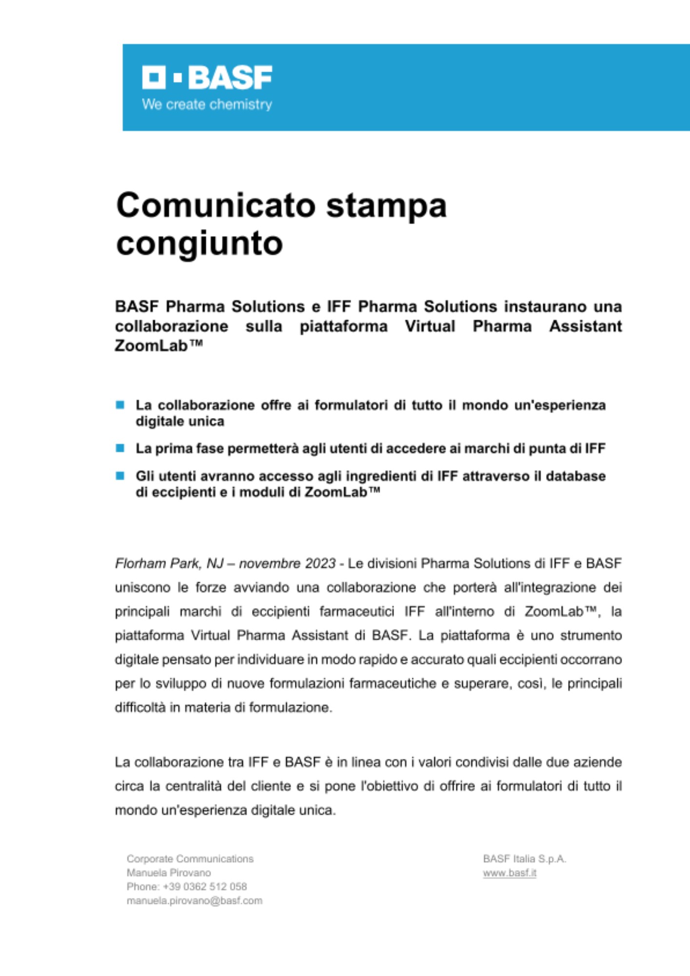Florham Park, NJ – novembre 2023 - Le divisioni Pharma Solutions di IFF e BASF uniscono le forze avviando una collaborazione che porterà all'integrazione dei principali marchi di eccipienti farmaceutici IFF all'interno di ZoomLab™, la piattaforma Virtual Pharma Assistant di BASF. La piattaforma è uno strumento digitale pensato per individuare in modo rapido e accurato quali eccipienti occorrano per lo sviluppo di nuove formulazioni farmaceutiche e superare, così, le principali difficoltà in materia di formulazione.